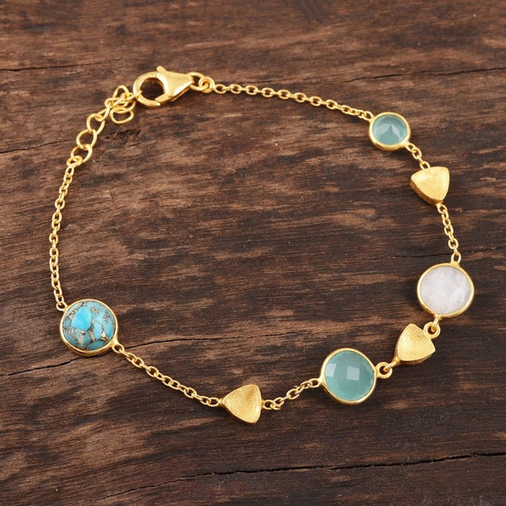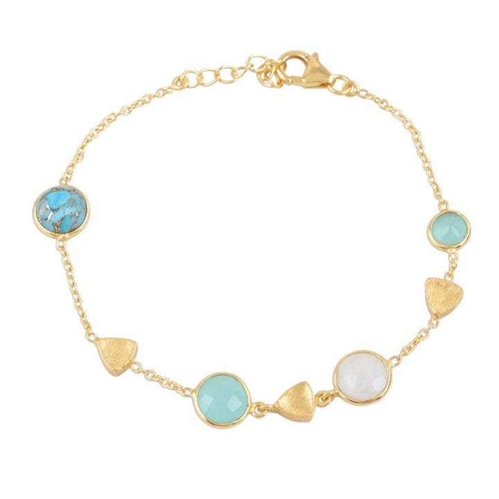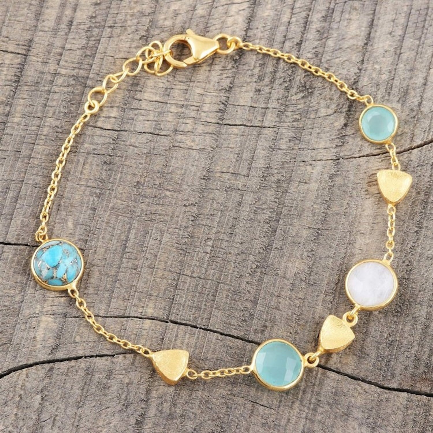 Handcrafted in India from 18k gold-plated 925 sterling silver, rainbow moonstone, chalcedony, and composite turquoise, with a combination finish. The adjustable bracelet measures between 7 and 8 inches and features a lobster claw clasp.