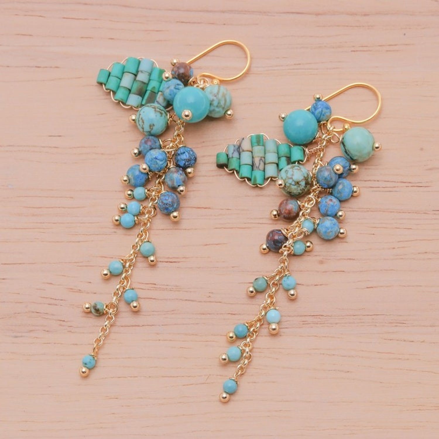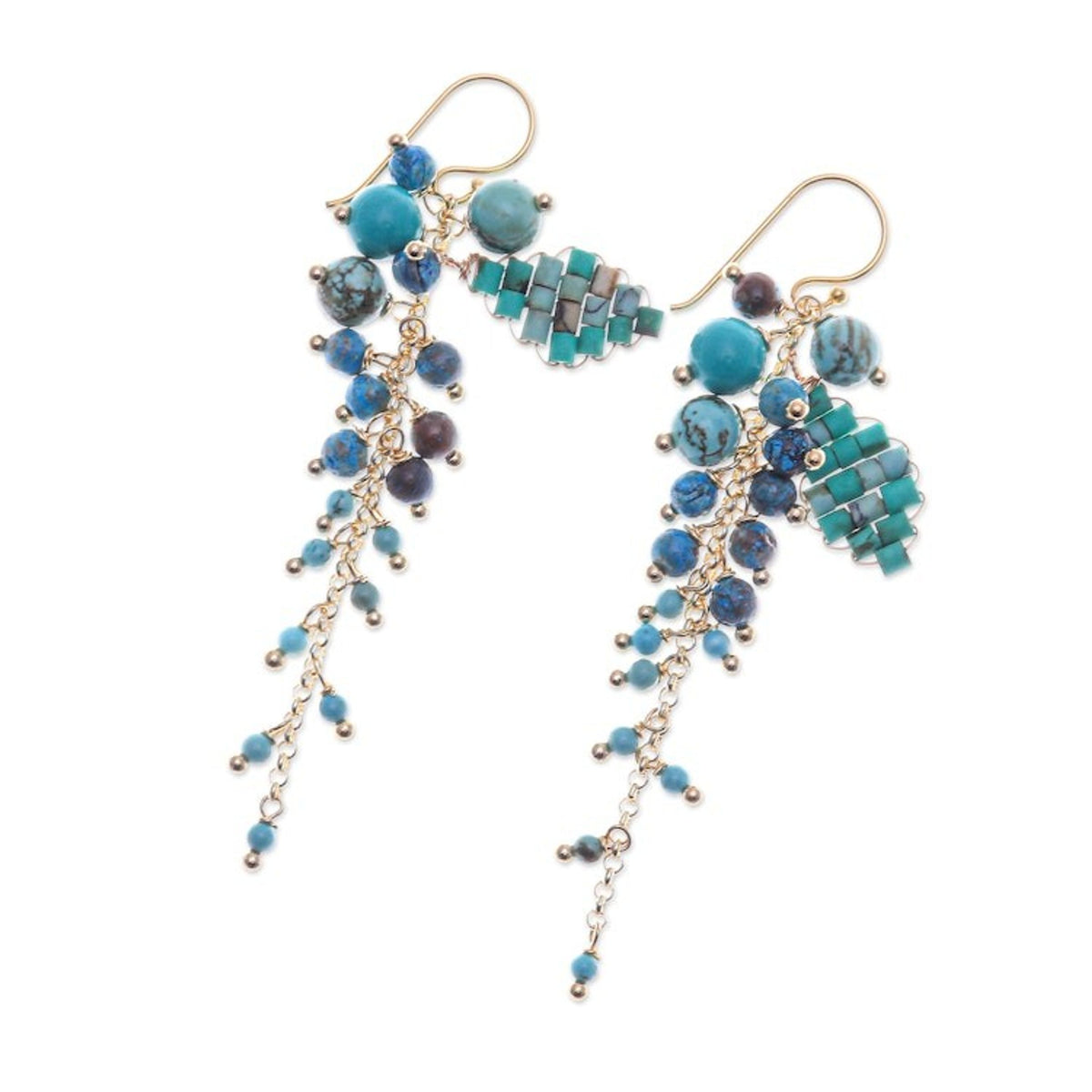 Handcrafted in Thailand from reconstituted turquoise, howlite, 18k gold-plated brass, and 18k gold-plated 925 sterling silver hooks, with a high polish finish. The earrings are 2.8 inches in length by 0.6 inches in width and feature a hook closure.