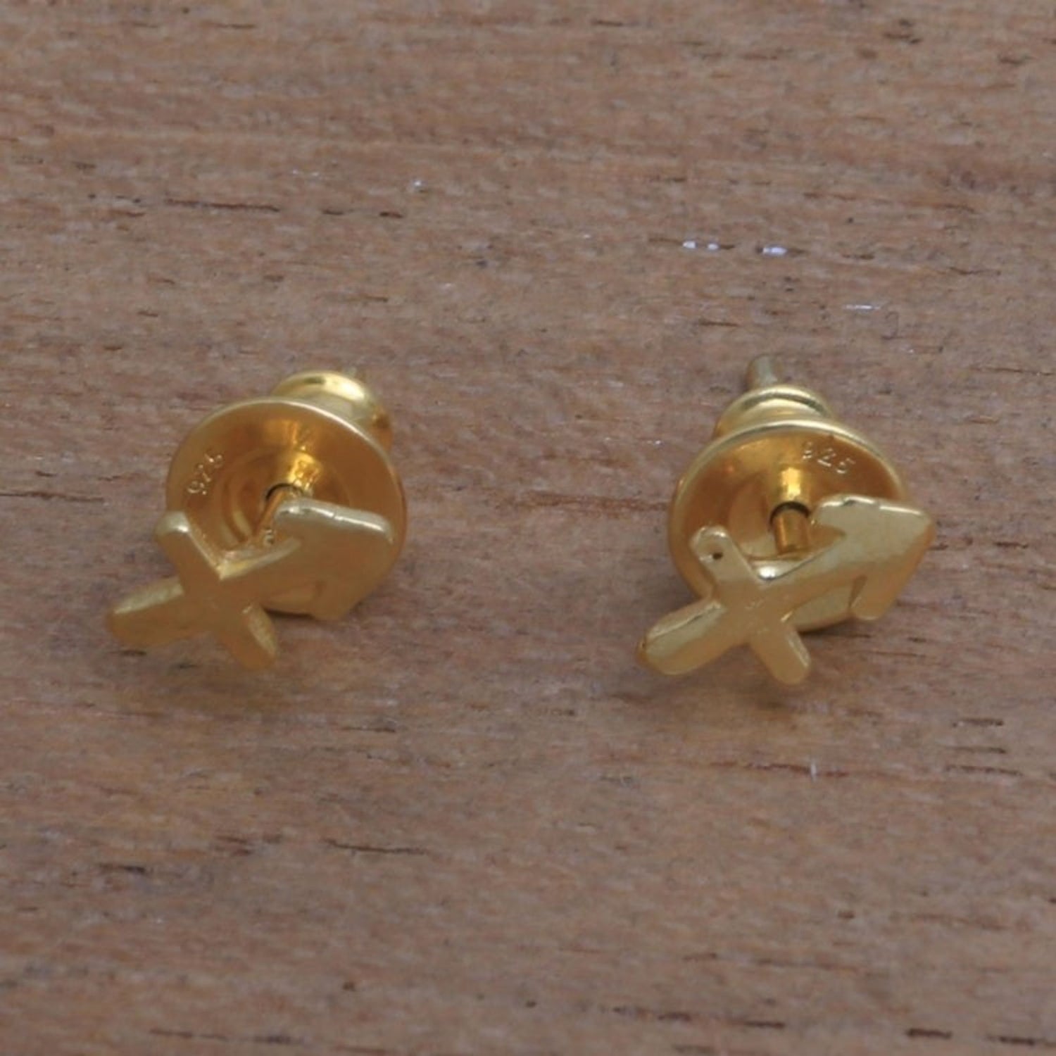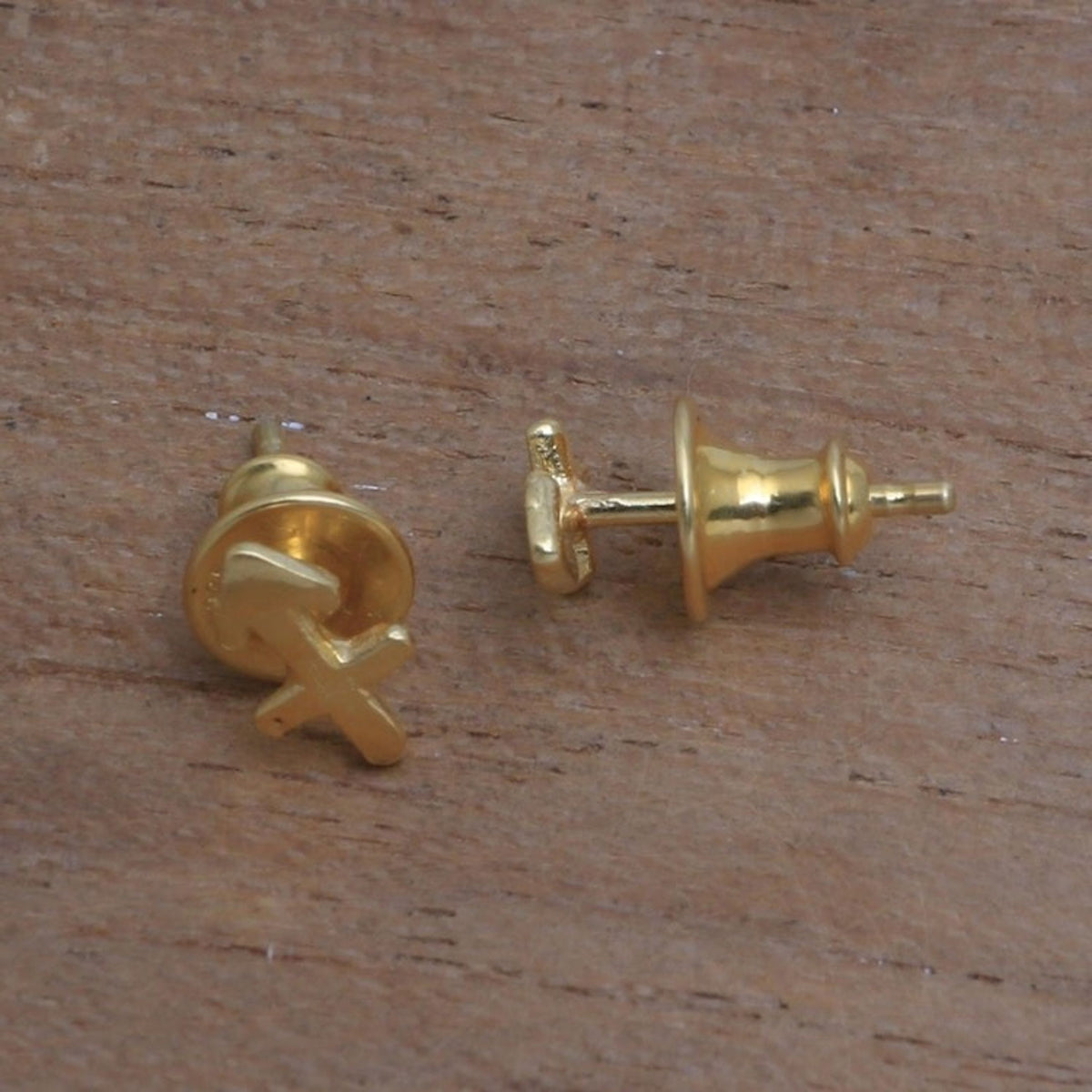 These 'Golden Sagittarius' stud earrings by Asmara Putra are a simple accessory for expressing your identity. Crafted of sterling silver with a gleaming 18k gold plating, the earrings feature the symbol for the zodiac sign Sagittarius. The high polish finish gives the earrings a beautiful shine. This piece reflects humility, resilience, and cultural pride, offering designs that honor Bali's heritage while embracing contemporary creativity.