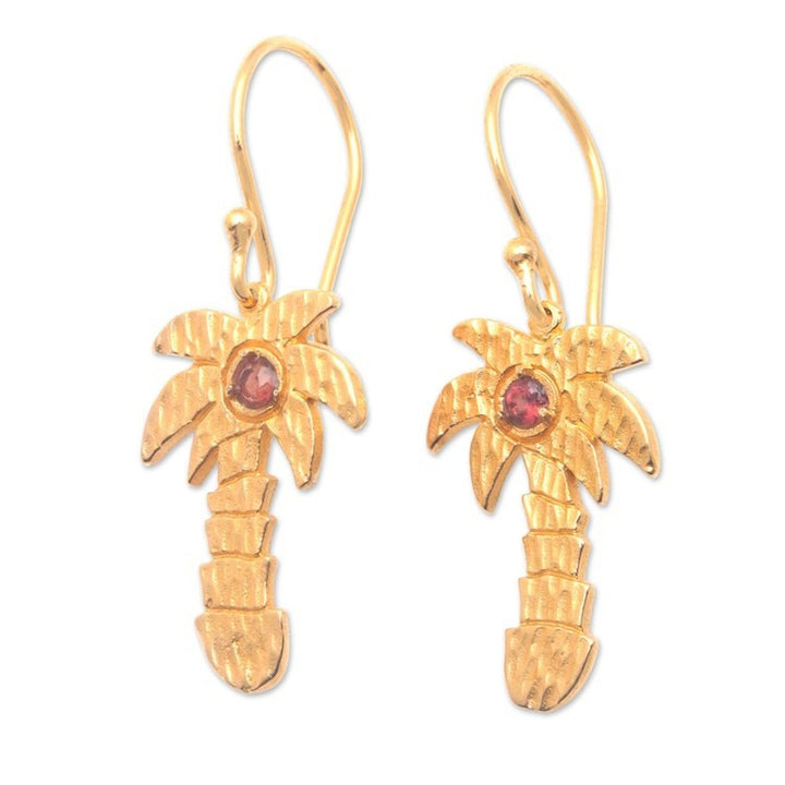 These 'Tropical Crimson' dangle earrings by Dewa Nyoman Oka evoke Bali's vibrant and tropical essence. The palm tree pendants are crafted from 18k gold-plated brass and feature a hammered finish for a lustrous look. As the centerpieces, natural garnet stones in a round cut add a stylish crimson hue. This piece is conceived as a bridge between past and present, blending traditional Balinese motifs with contemporary expression.