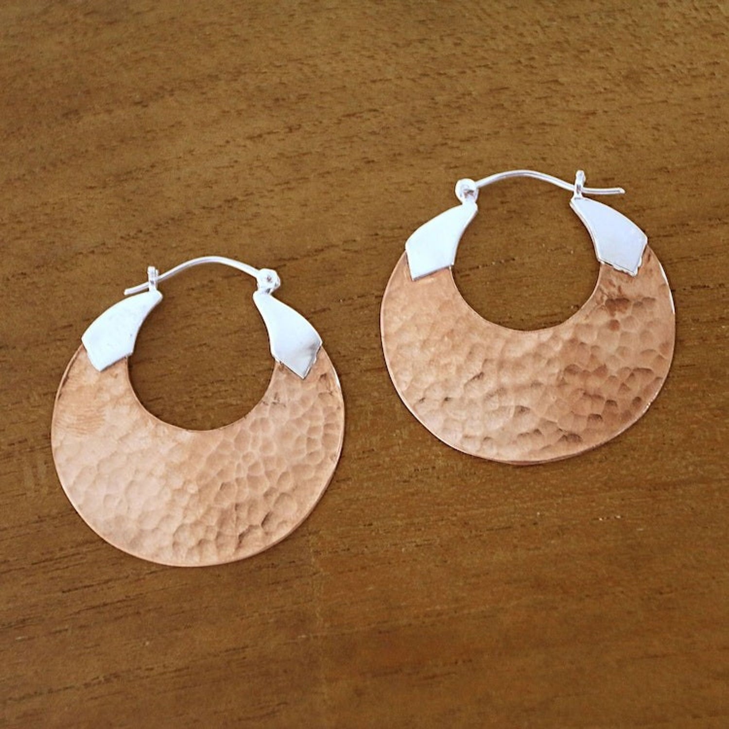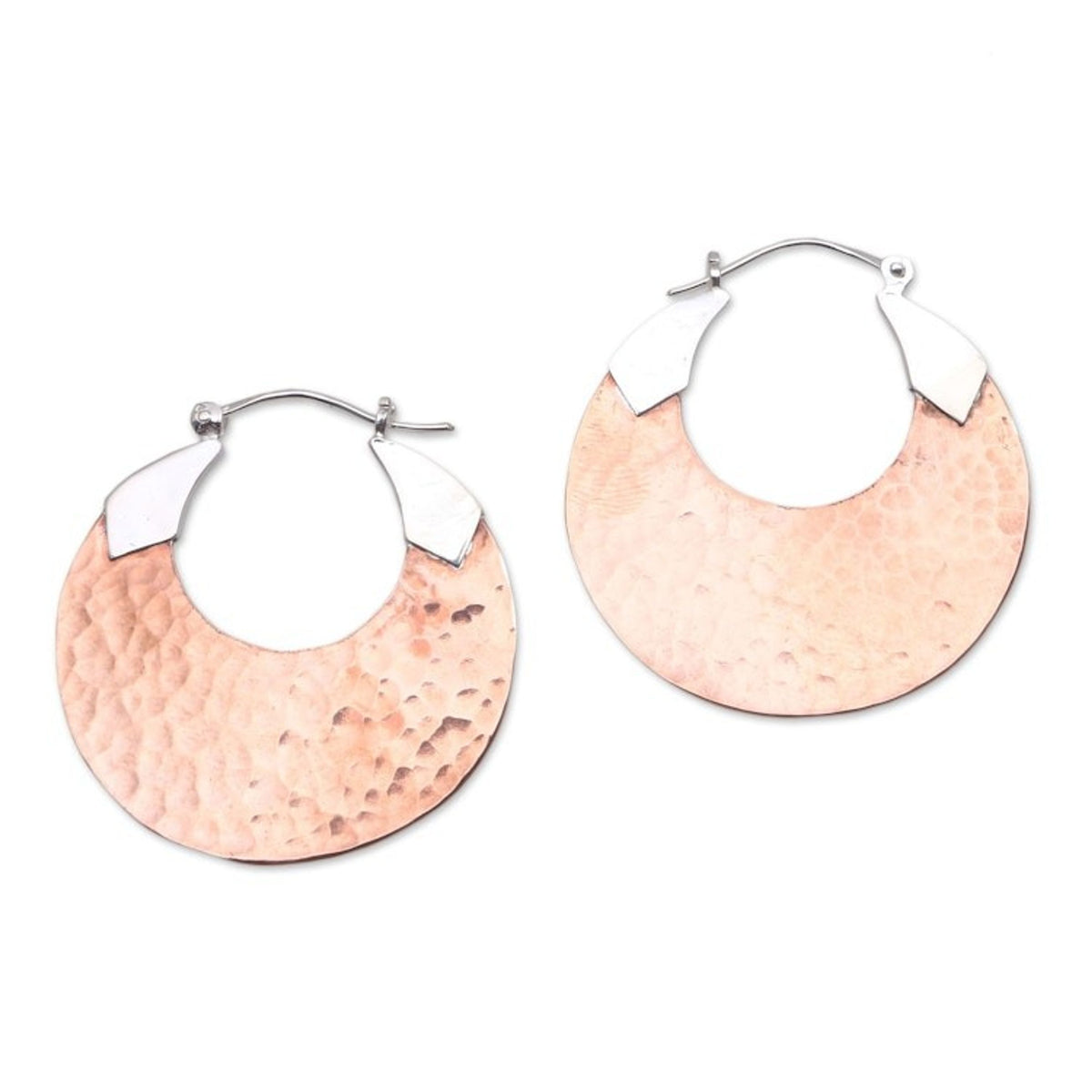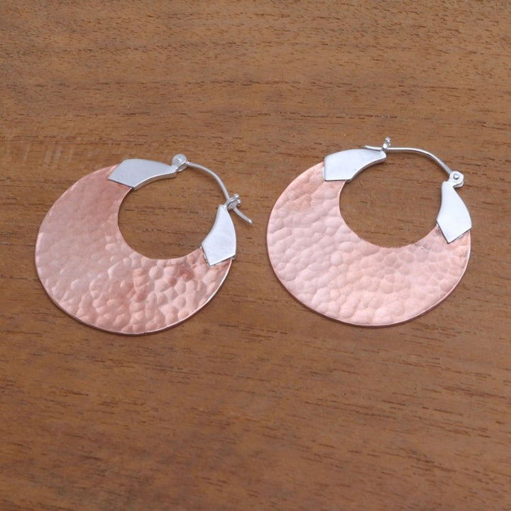 These 'Radiant Reflections' hoop earrings by Nyoman Nartawan are a stunning pair featuring hammered moons of 18k rose gold-plated copper. The saddle-back clasps connect to the copper hoops with pennants of sterling silver, creating a distinctive contrast. This piece is rooted in traditional Balinese silversmithing, yet it balances innovation with heritage, reflecting the artist's dedication to quality and artistry.