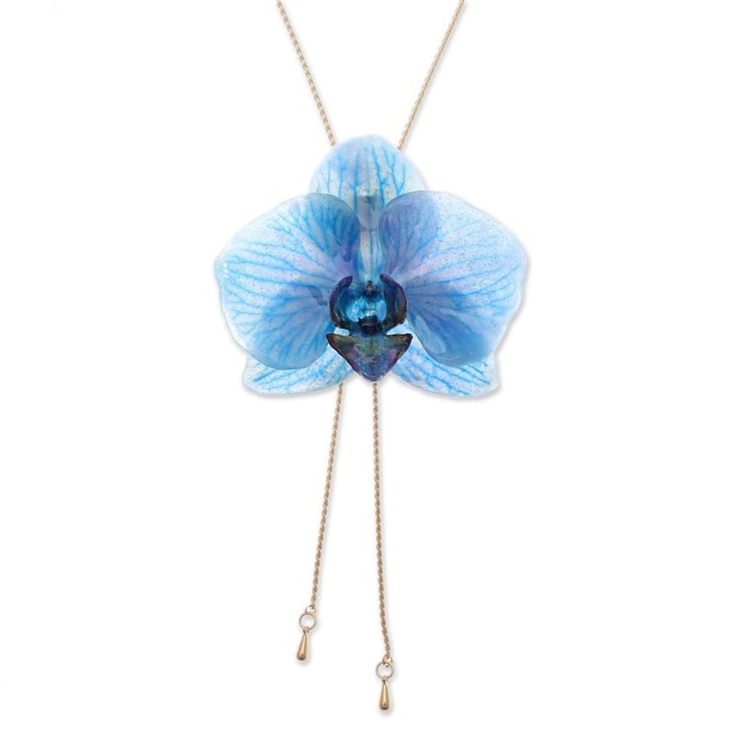 Handcrafted in Thailand from resin-coated phalaenopsis orchid and a 22k gold-plated brass snake chain, with a high polish finish. The adjustable necklace has a 34.5-inch inner circumference, and its pendant measures 2.2 inches in length by 2.6 inches in width.