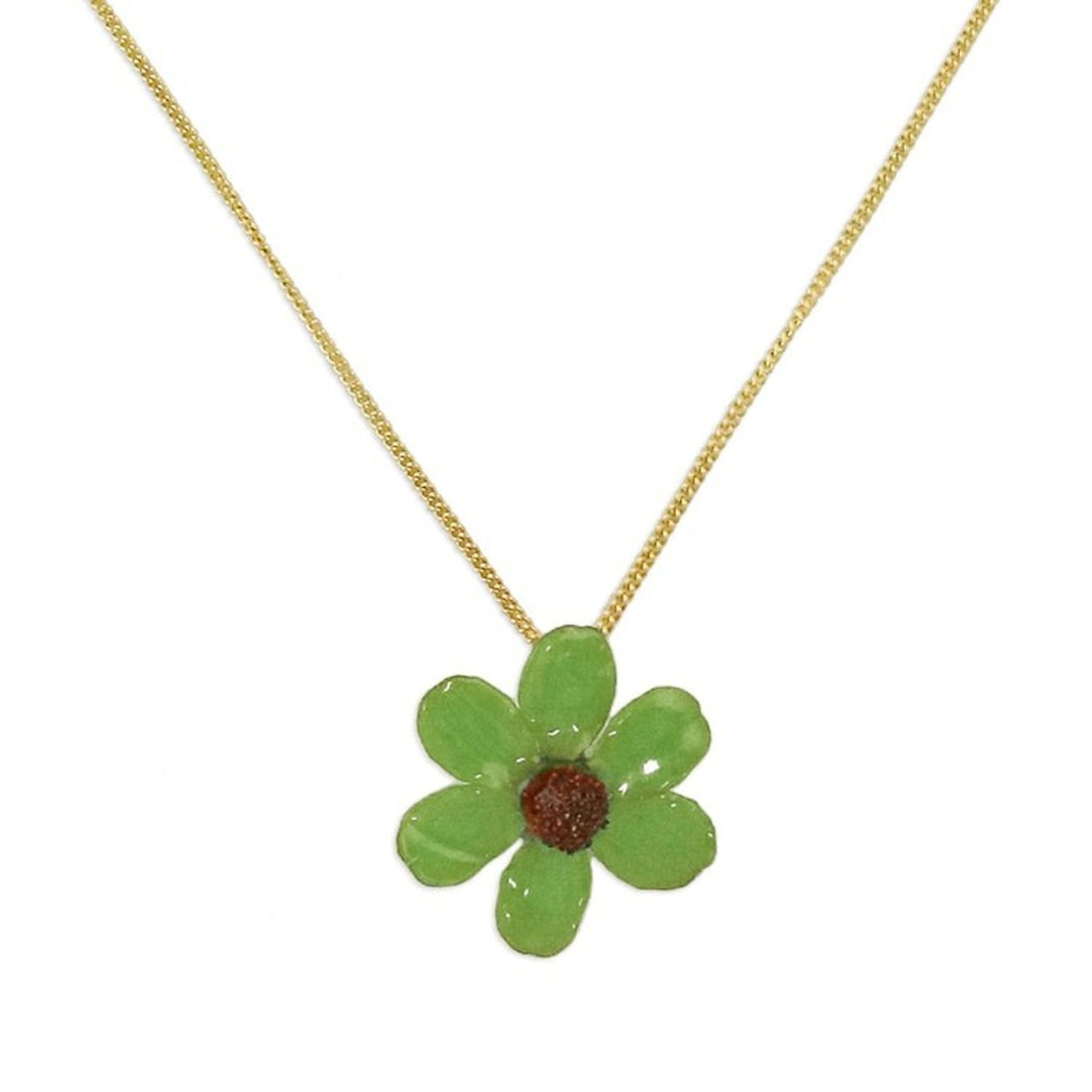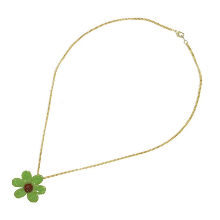 Handcrafted in Thailand from dyed natural zinnia flower in resin lacquer and 22k gold-plated brass, with a high polish finish. The necklace is 18.5 inches long with a 2 mm width. The pendant is 1.3 inches in length by 1.4 inches in width.
