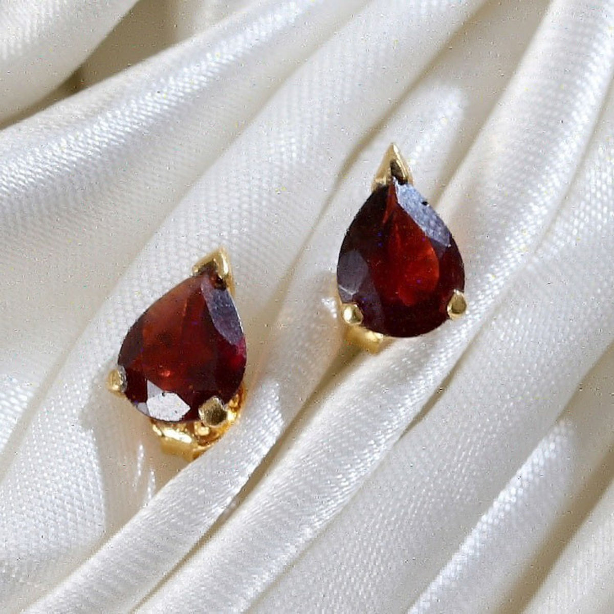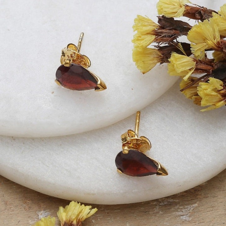 Handcrafted in India from 22k gold-plated 925 sterling silver and garnet, with a high polish finish. The earrings are 0.4 inches in length by 0.3 inches in width and feature a post-back closure.