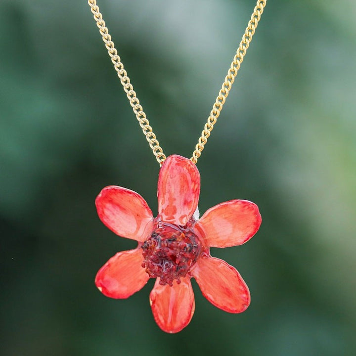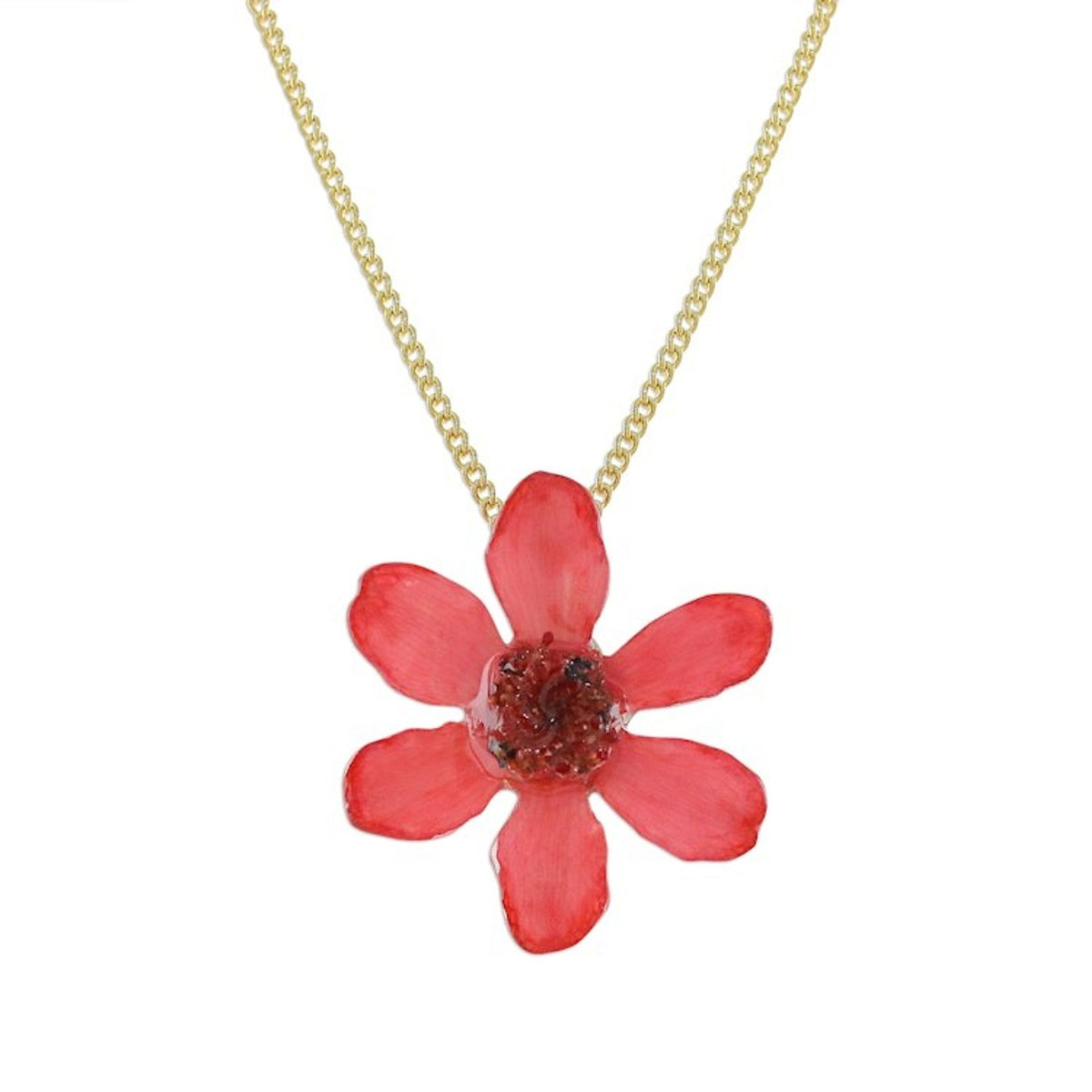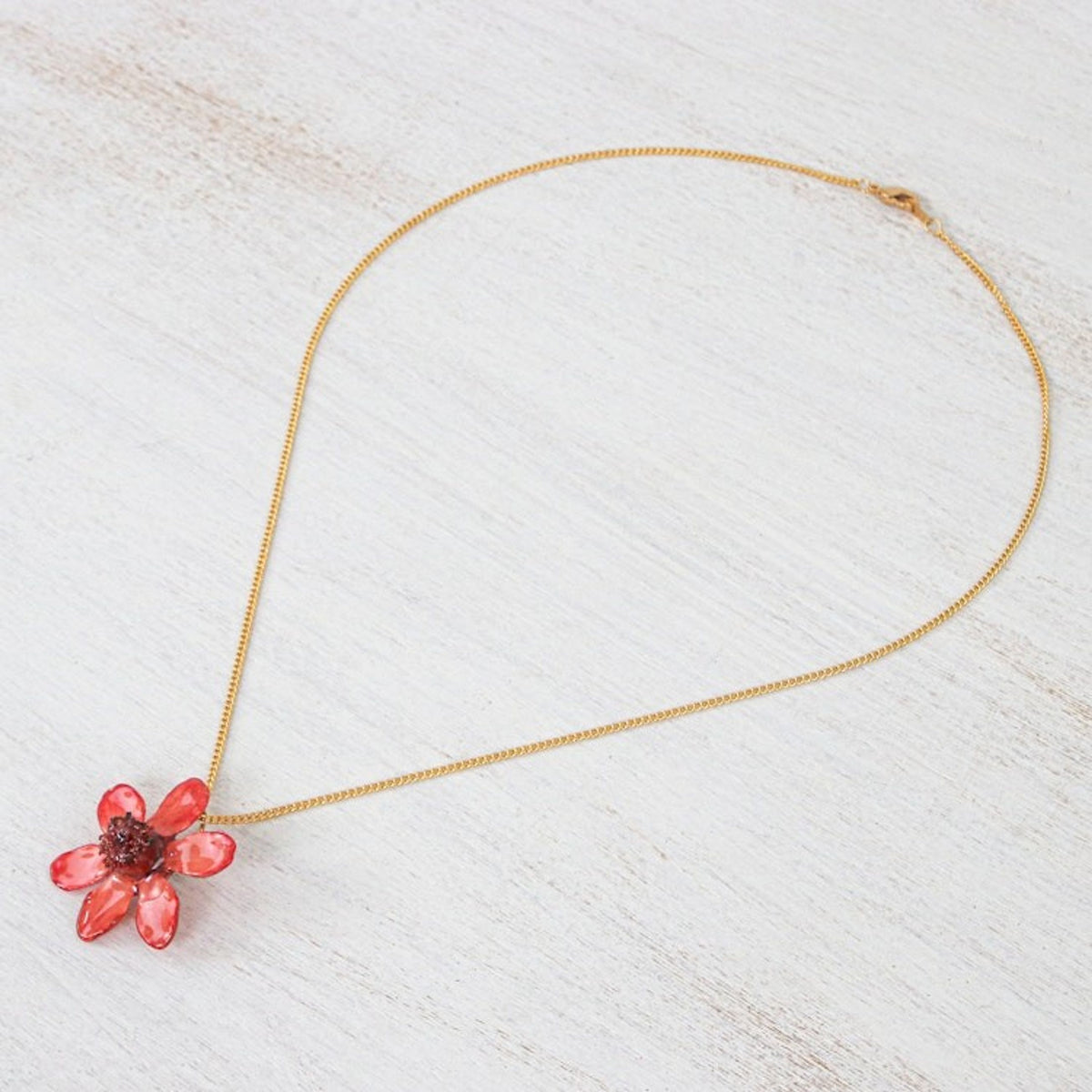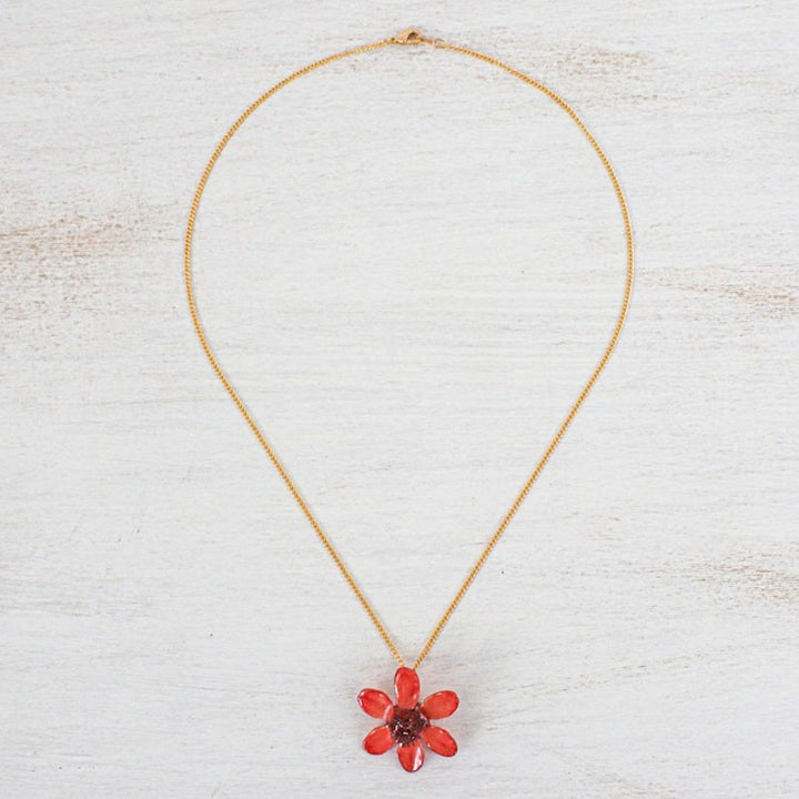 Handcrafted in Thailand from a dyed natural zinnia flower in resin lacquer and 22k gold-plated brass, with a high polish finish. The necklace is 18.5 inches long with a 2 mm width. The pendant is 1.2 inches in length by 1.2 inches in width.