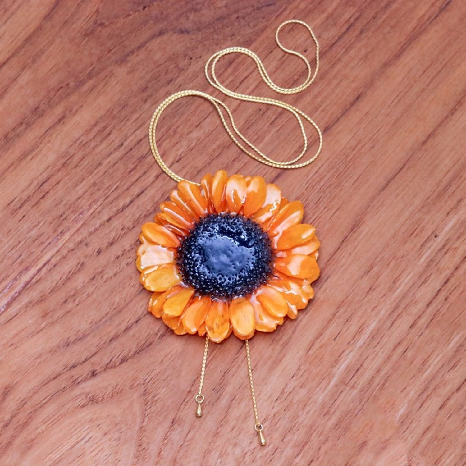 Handcrafted in Thailand from 22k gold-plated brass and a resin-coated sunflower, with a high polish finish. The adjustable necklace has a 34.5-inch inner circumference, and its pendant measures 3.3 inches in length by 3.3 inches in width.