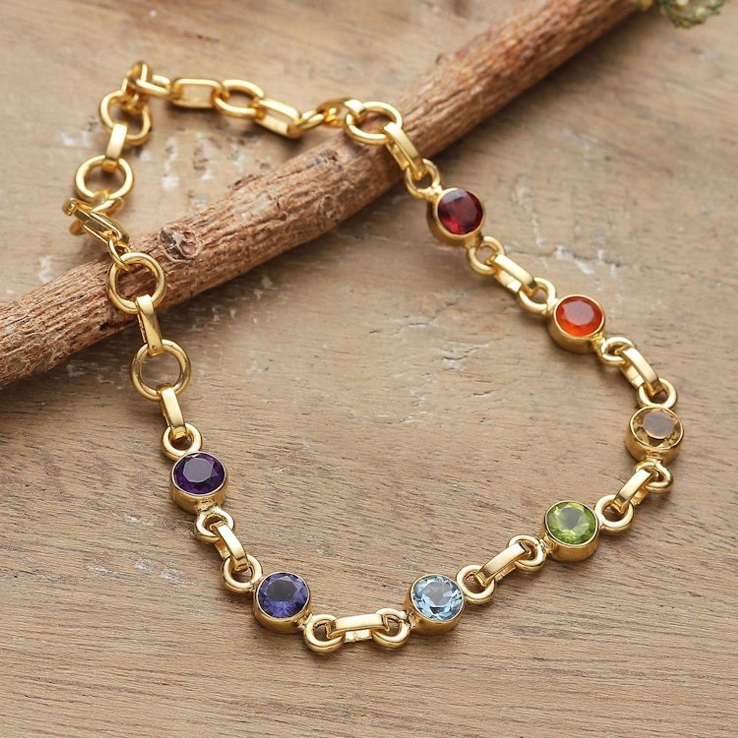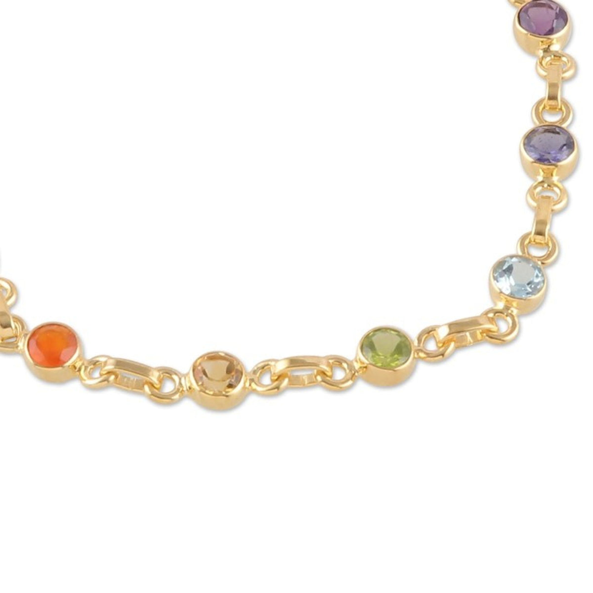This 'Inner Universe' bracelet by Alok Jain reunites bright round gems to represent the chakra centers. The 22k gold-plated bracelet, embraced by sterling silver structures, features amethyst, iolite, carnelian, garnet, peridot, citrine, and blue topaz jewels, totaling over three carats. The piece is a beautiful blend of artistry and spiritual growth.