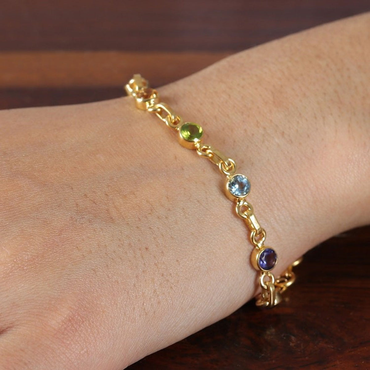 Handcrafted in India from 22k gold-plated sterling silver and various gemstones, with a high polish finish. The adjustable bracelet measures between 6 and 7.8 inches and features a lobster claw clasp.