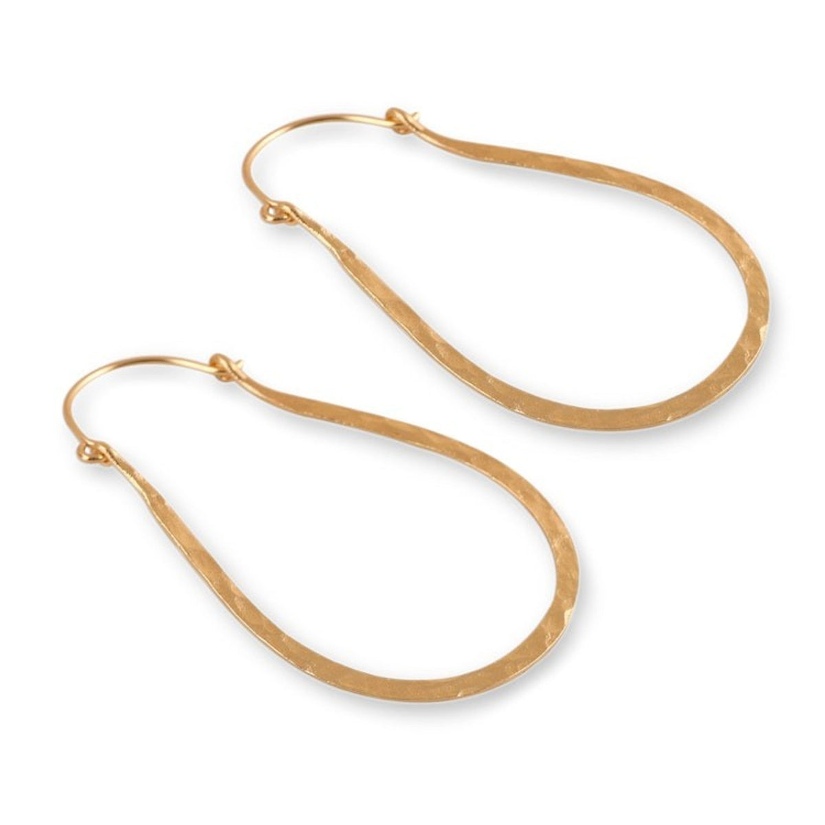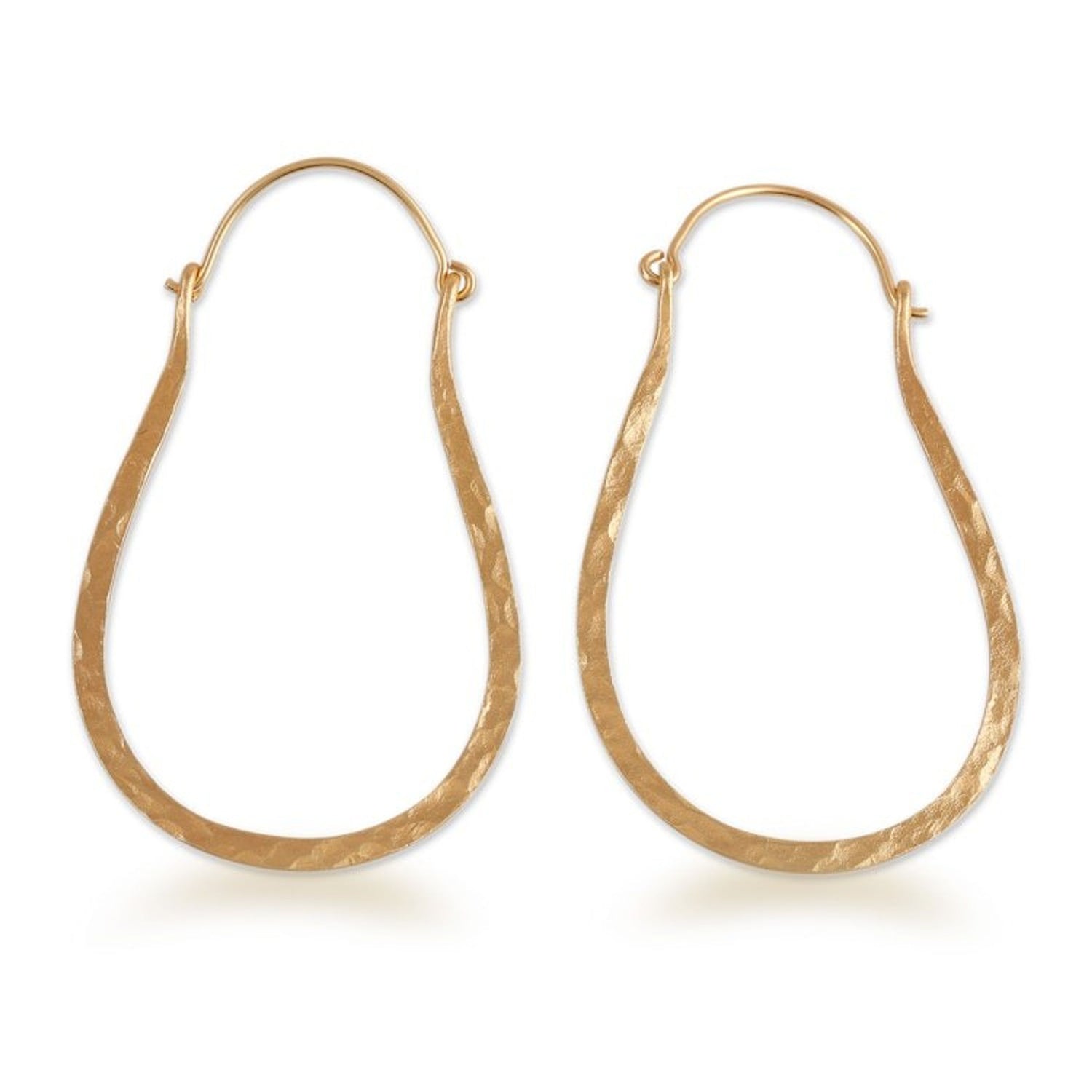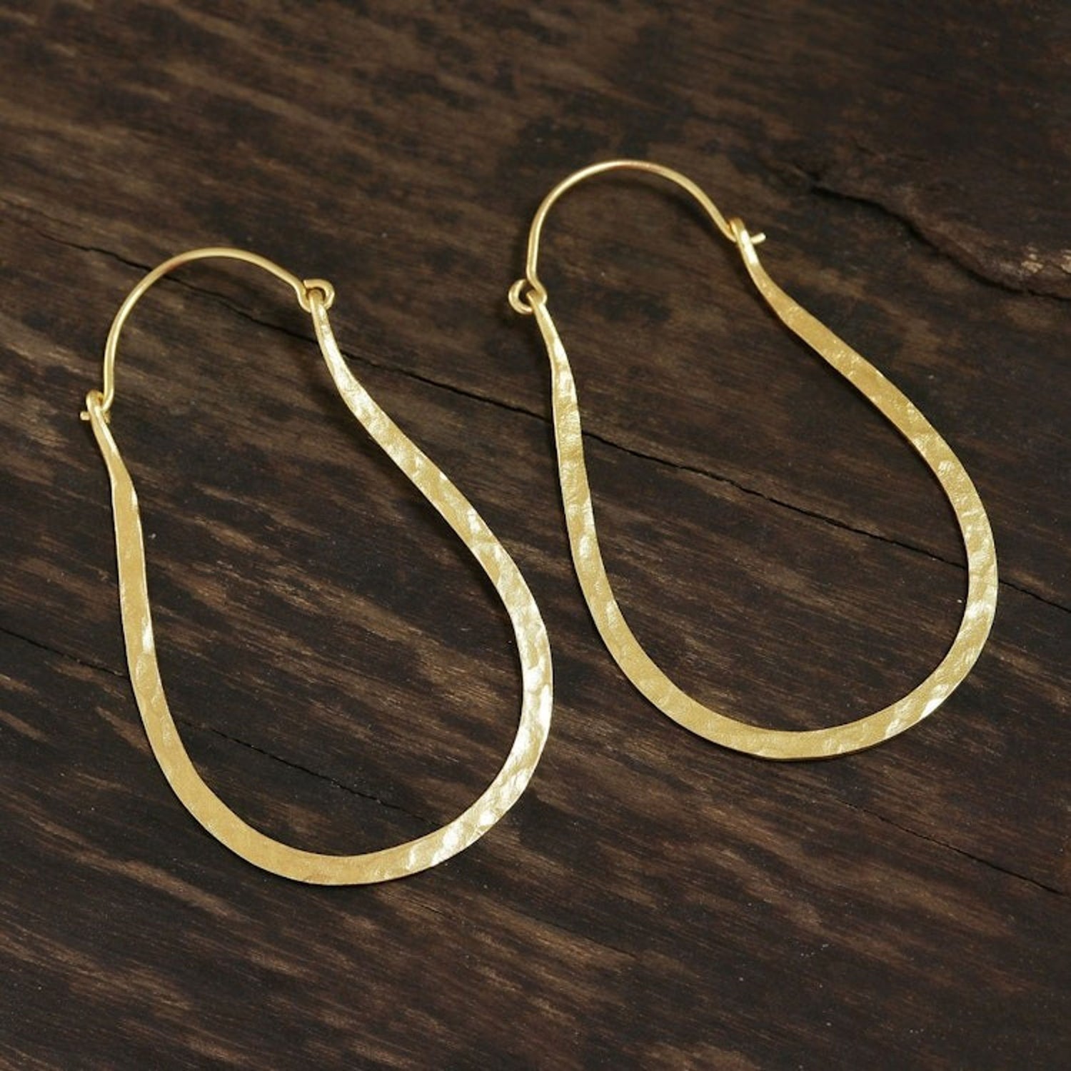 Handcrafted in India from 22k gold-plated 925 sterling silver, with a hammered finish. The earrings are 2.2 inches in length by 1.3 inches in width and feature a saddleback/sea catch closure.