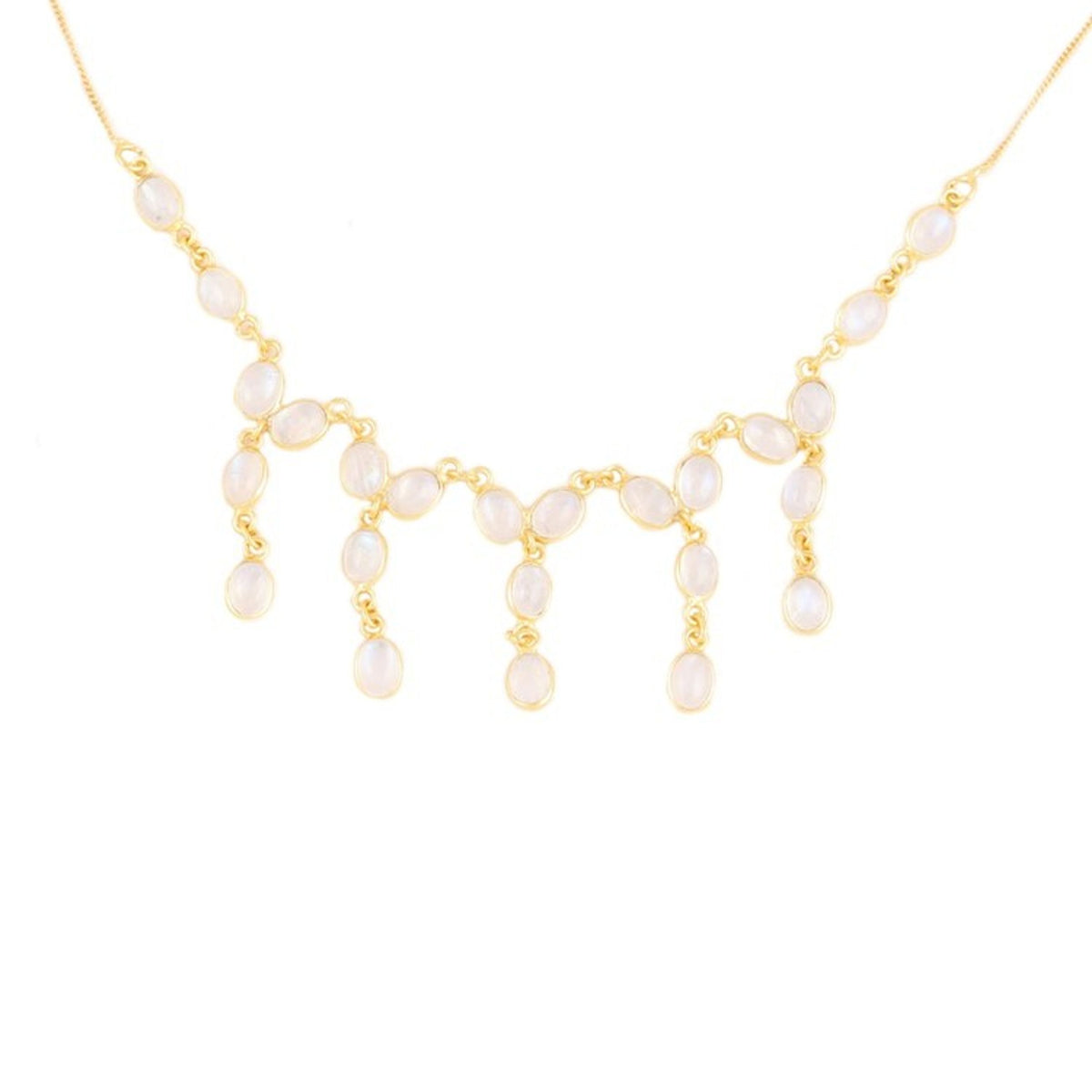 This 'Creativity Drops' waterfall necklace by Alok Jain is a high-quality creation ideal for any occasion. The necklace features rainbow moonstones that add a luminous touch to the accessory. The stones are said to bring creativity and harmony while strengthening confidence. This 22k gold-plated sterling silver necklace has a high polish finish, making it a beautiful and elegant piece.