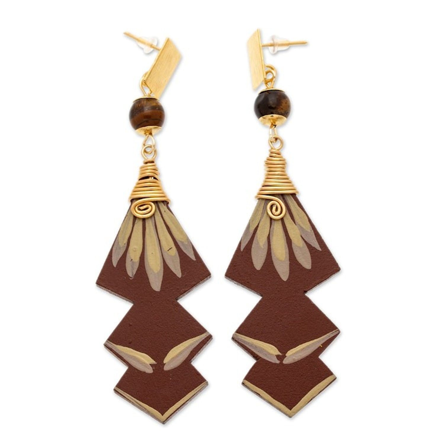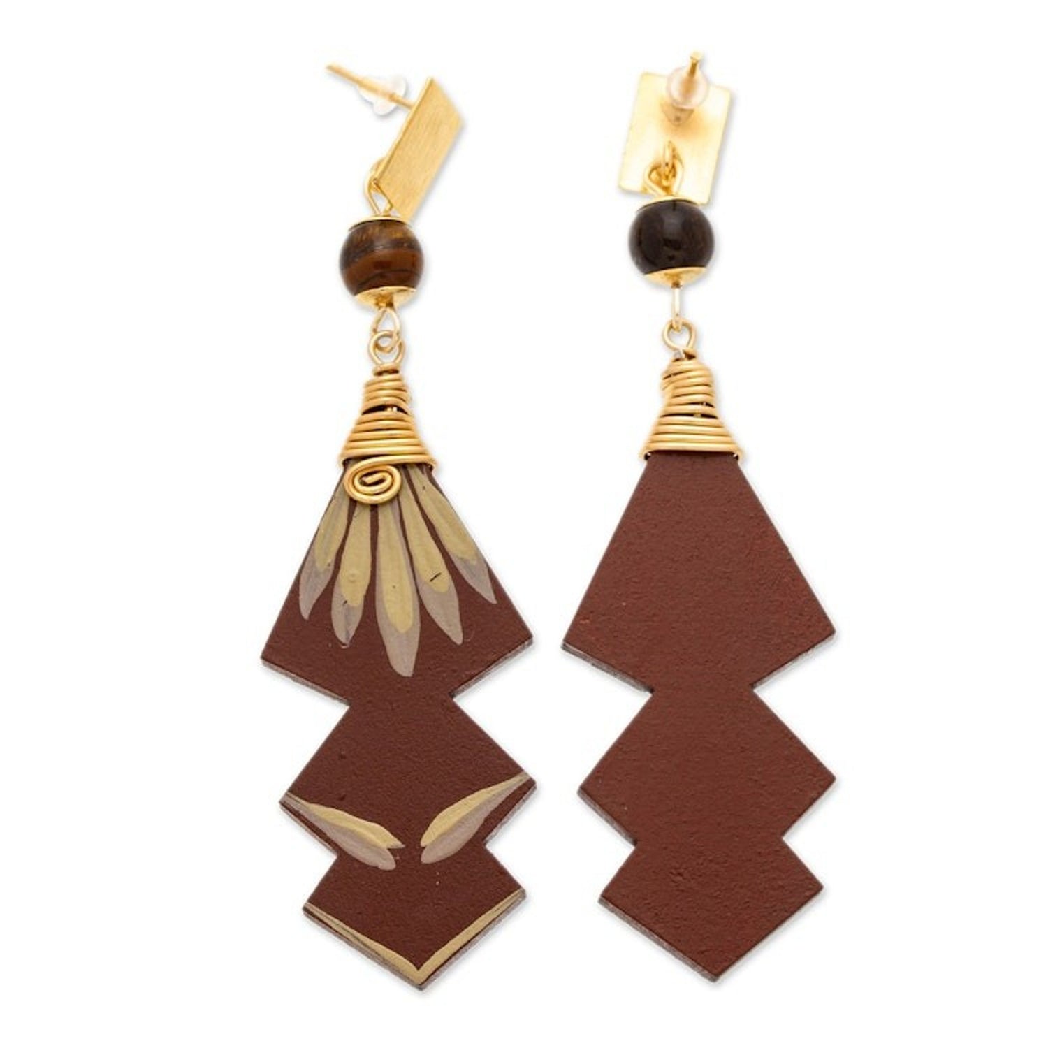 These 'Chocolate Splendor' dangle earrings by Alejandra Gallardo unite chocolate hues and golden sparks. Inspired by Mexico's pre-Hispanic cultures, these dangle earrings are made of wood and 24k gold-plated brass accents. Natural agate gems crown the design, adding their exquisite light. This piece reflects the artist's commitment to celebrating the color, vibrancy, and authenticity of Mexican tradition.