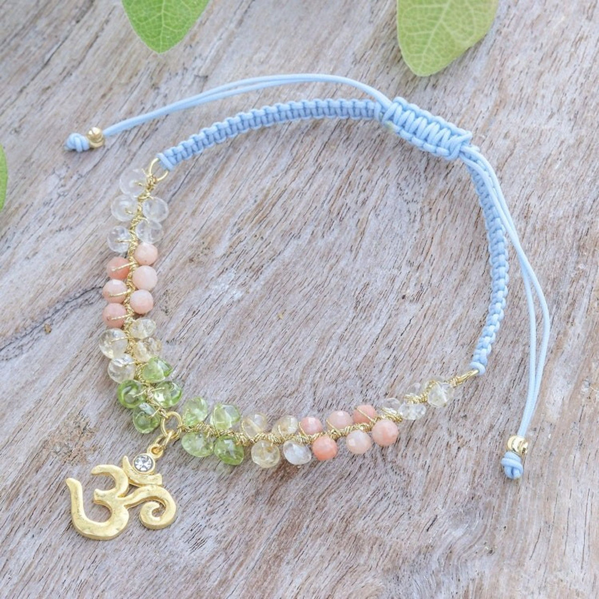 The 'Om Glam' pendant bracelet by Saranarat is a boho-luxe bracelet where traditional macrame meets precious gemstones in perfect harmony. This exquisite accessory showcases a gold-plated pendant shaped like the om symbol, adding a touch of enlightened glamour. A stunning array of peridot, rhodonite, citrine, and quartz brings a pop of color to the design. This piece embodies creativity, patience, and devotion.