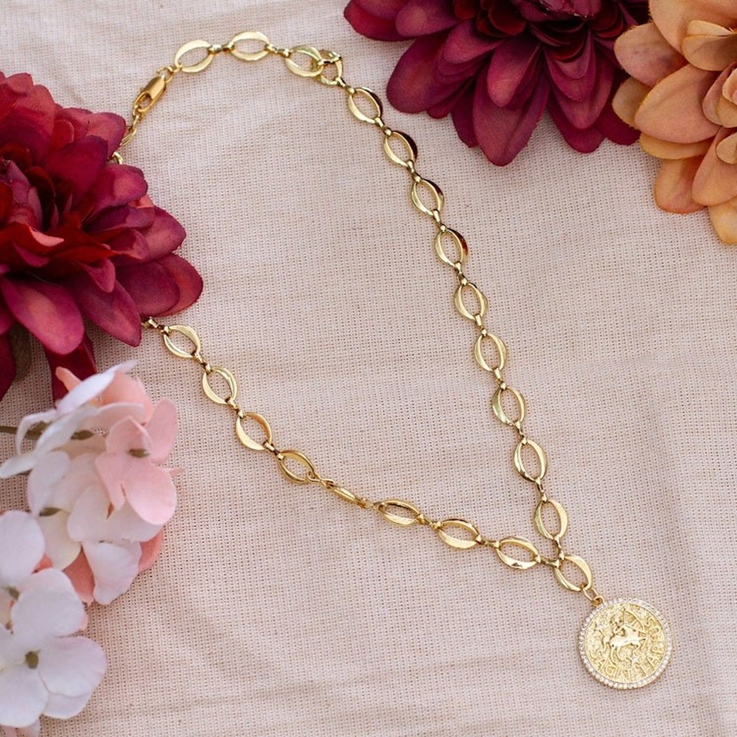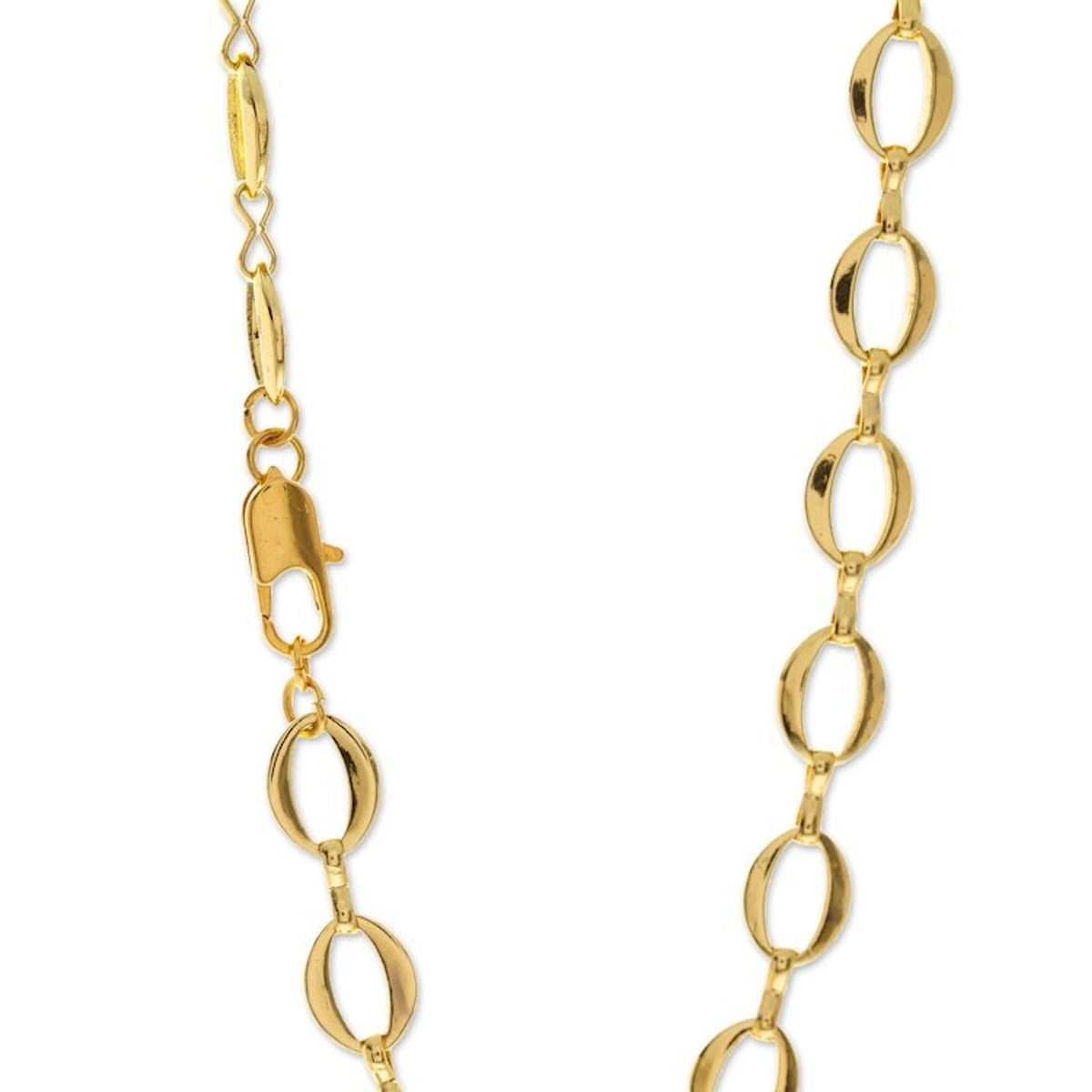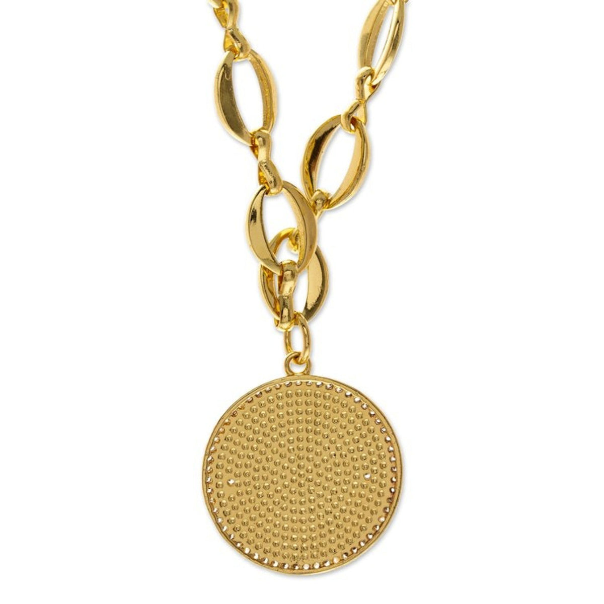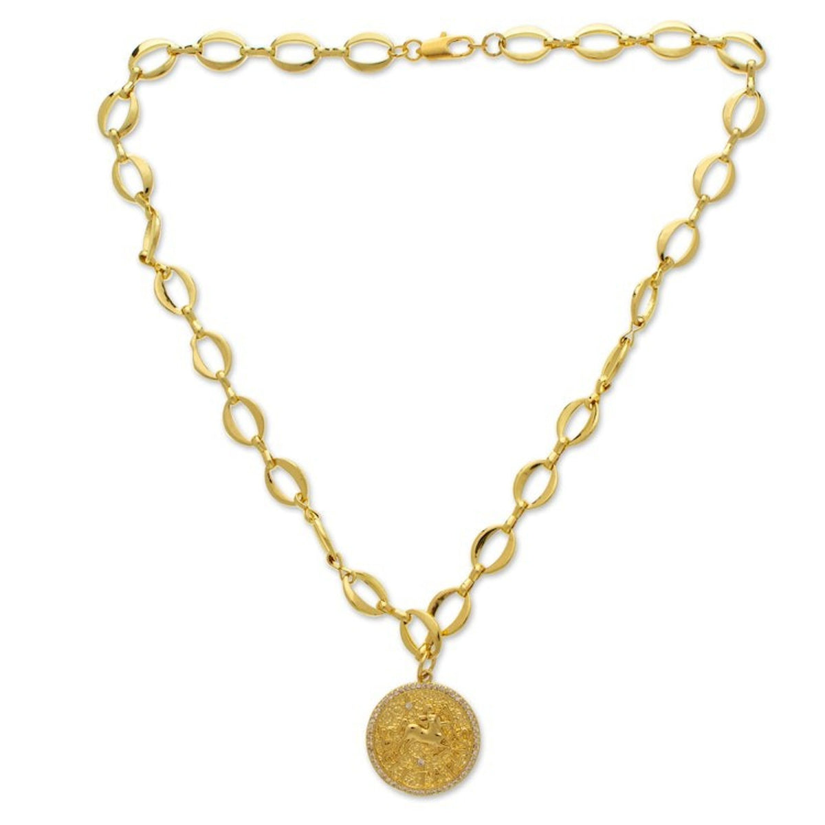 Handcrafted in Mexico from 24k gold-plated brass and cubic zirconia, with a high polish finish. The necklace is 17.8 inches in inner circumference, and its pendant measures 1.4 inches in length by 0.8 inches in width.