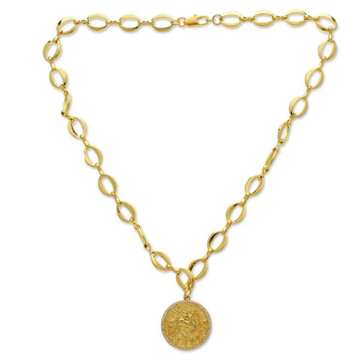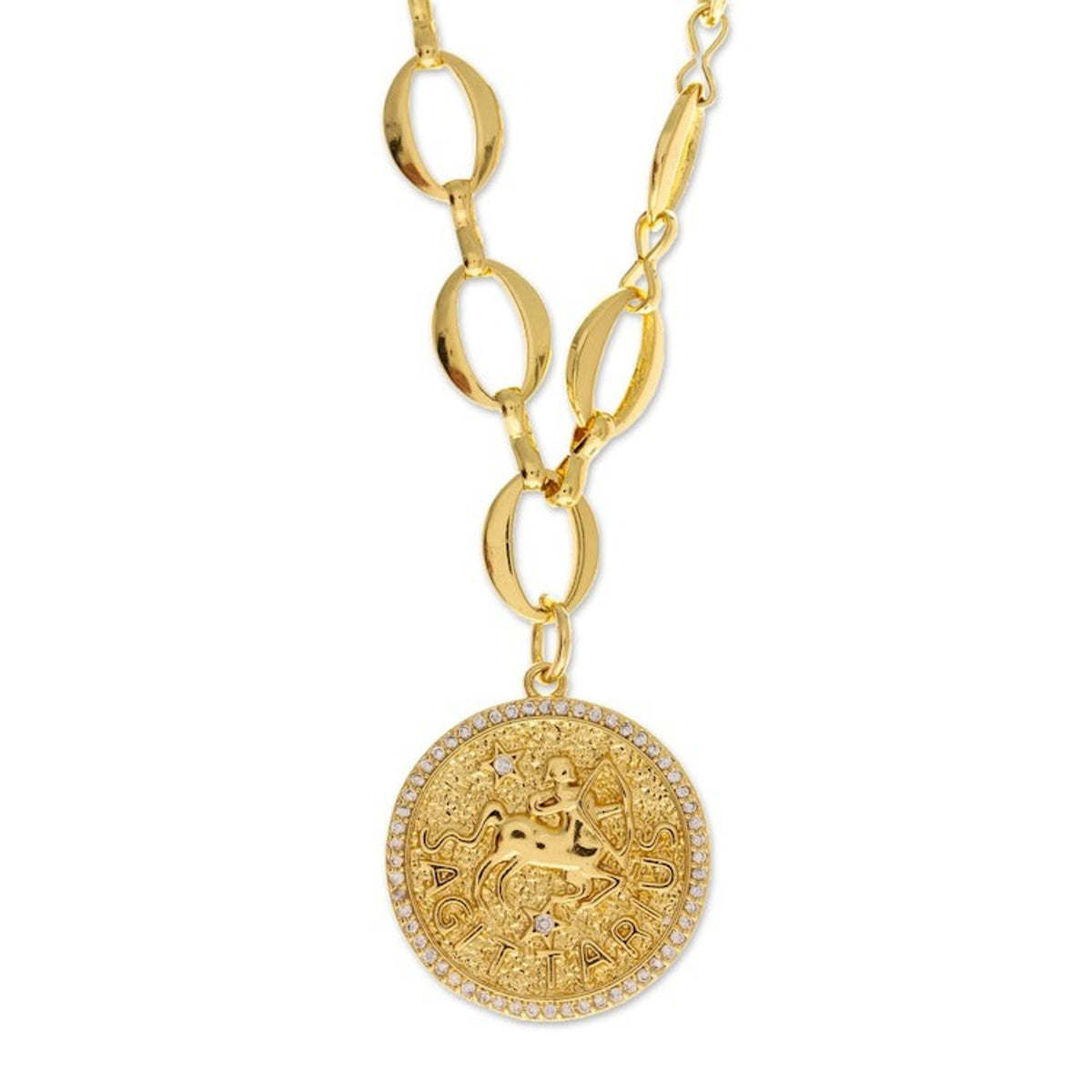 The 'Sagittarius Born' pendant necklace by Ali Guzman features Sagittarius, the constellation of the adventurous and honest. The sublime round pendant, crafted from 24k gold-plated brass, is enriched by cubic zirconia stones that shine like the sky. This piece reflects the artist's belief that jewelry is a channel for energy, emotion, and transformation.