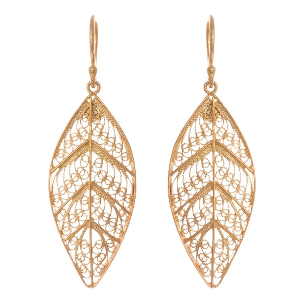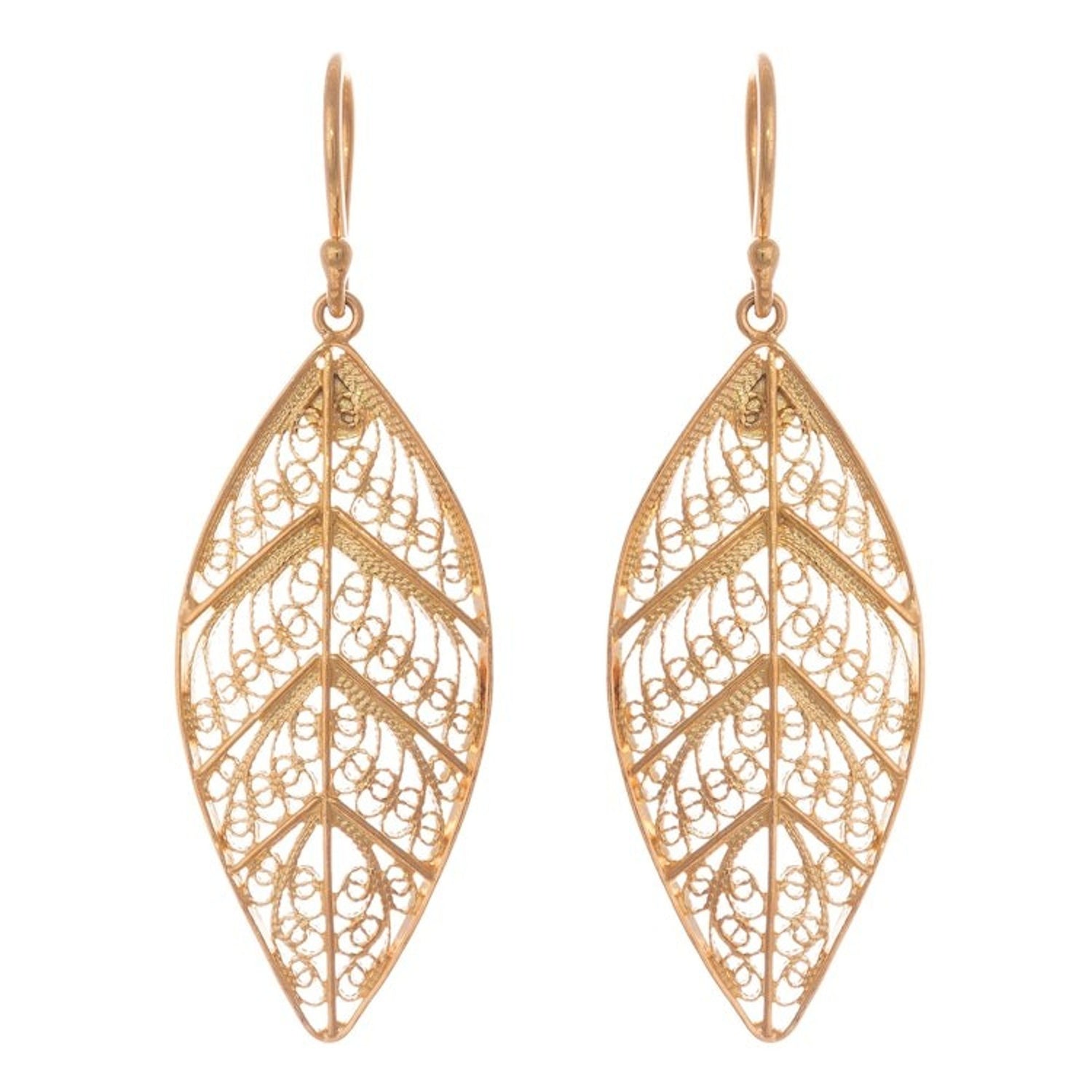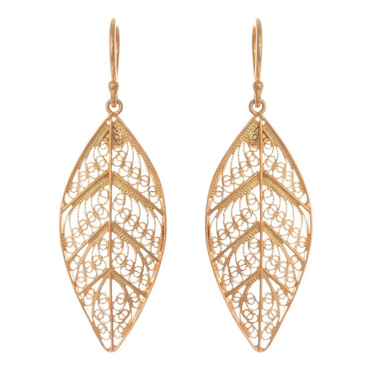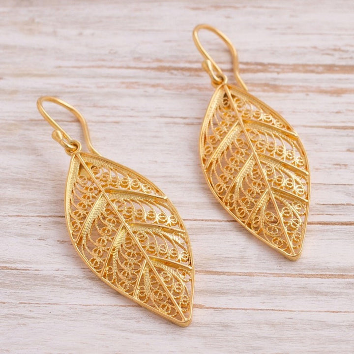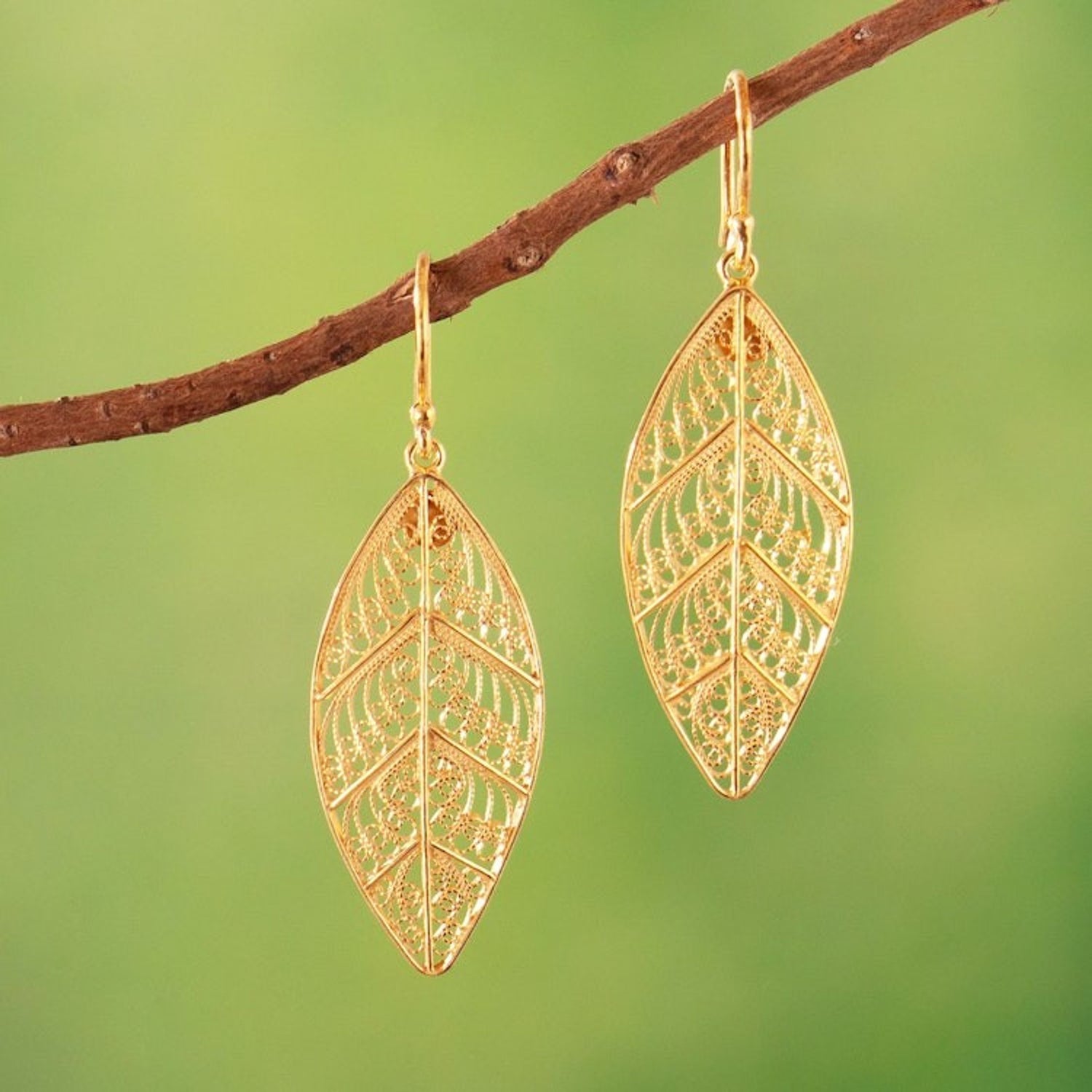 The 'Mystery of the Forest' dangle earrings by Paola Siza are a bright and mysterious pair. The artisan handcrafts two dazzling leaves from sterling silver with a 24k gold plating, featuring intricate filigree openwork. The magnificent earrings dangle from hooks, reflecting the artist's commitment to creating exquisite jewelry and preserving filigree heritage.