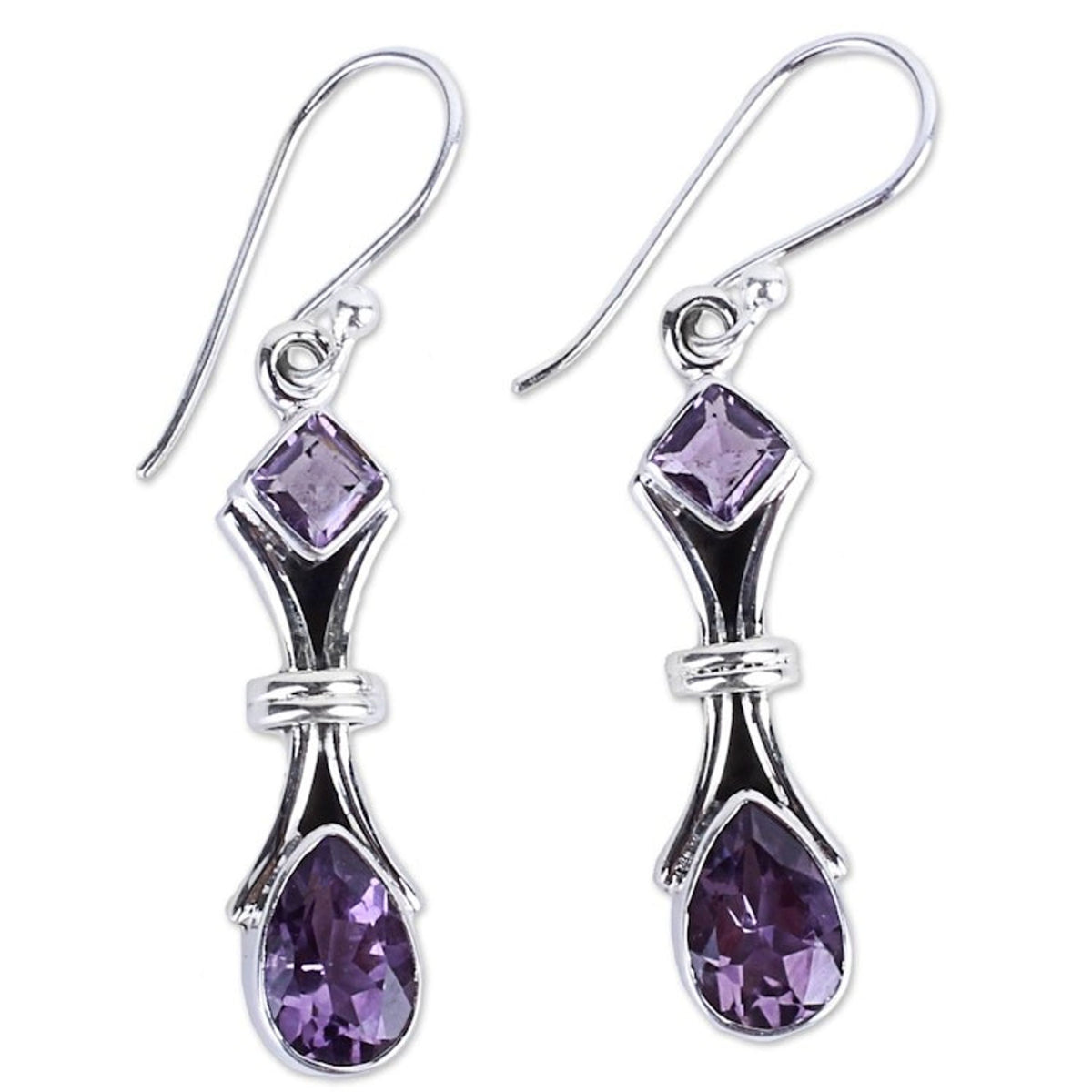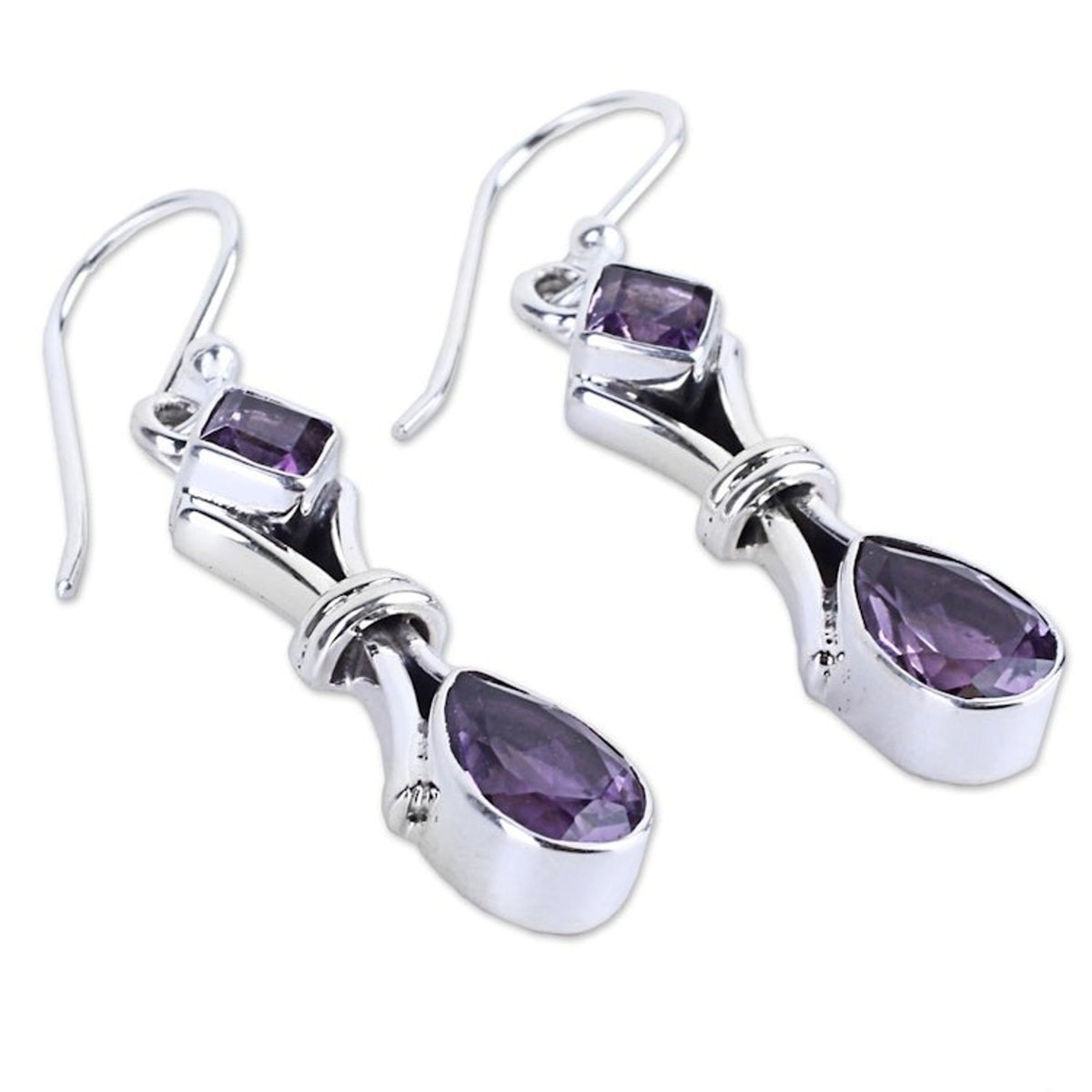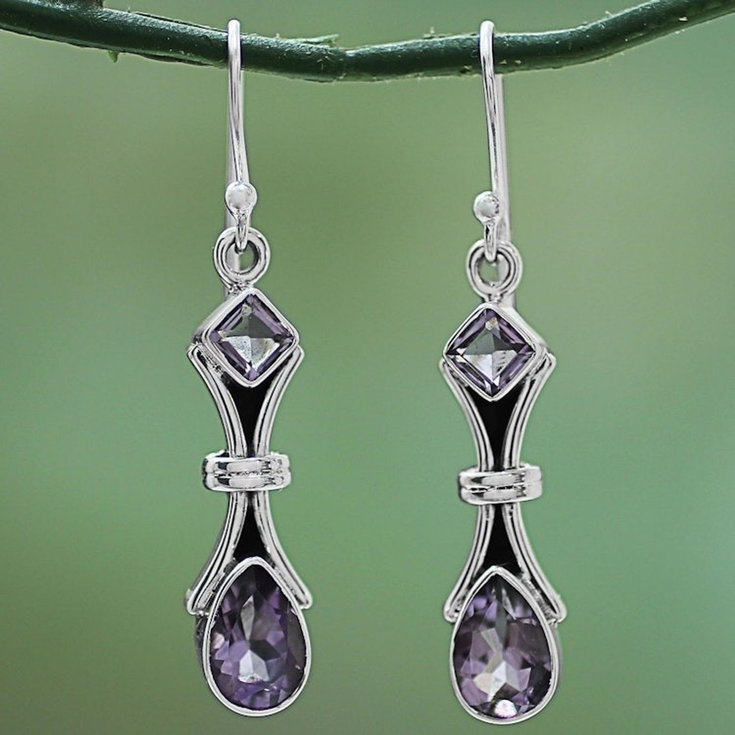 Handcrafted in India from 925 sterling silver and amethyst, with a high polish finish. The earrings are 1.7 inches in length by 0.3 inches in width and feature a hook closure.
