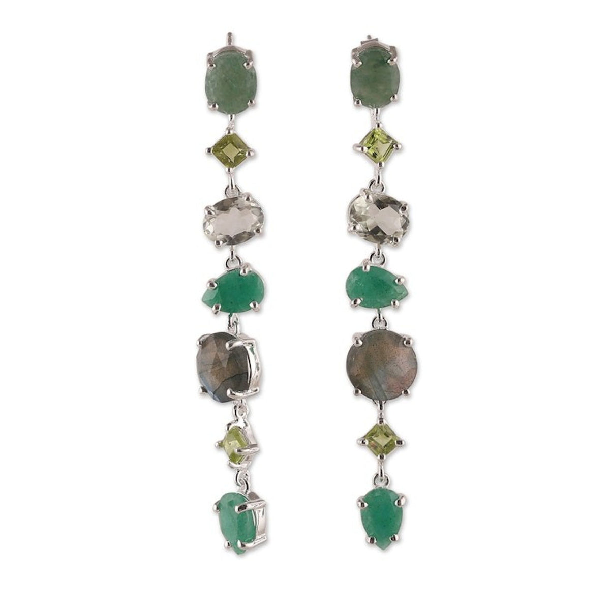 These 'Enchanted Green' dangle earrings by Neetu Barathi charm with a lucky green palette. Crafted in India, the sterling silver earrings hold stunning gems in elegant prong settings, totaling 25 carats. The arrangement includes faceted green quartz, peridot, labradorite, prasiolite, and aventurine stones. This piece is a beautiful blend of tradition and modernity, using sterling silver and colorful gemstones.