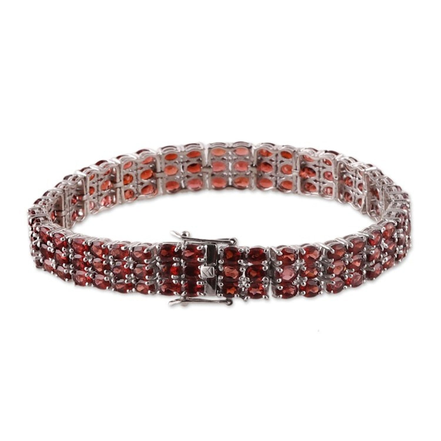 Handcrafted in India from rhodium-plated 925 sterling silver and garnet, with a high polish finish. The bracelet is 7.8 inches long with a 0.4-inch width and features a hidden box clasp.