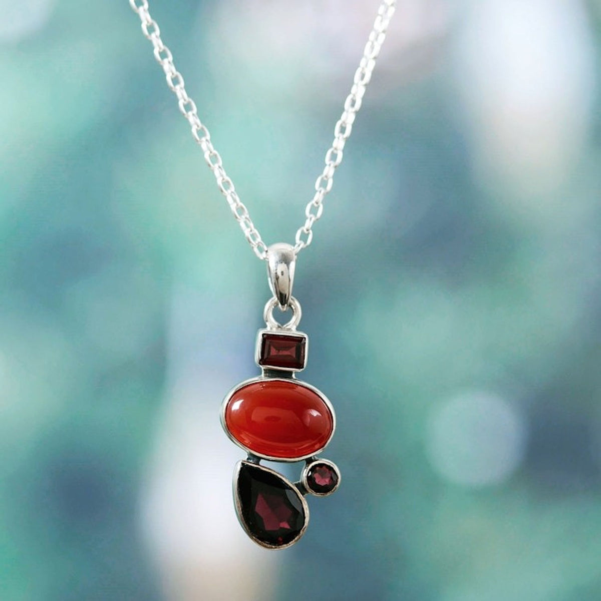 The 'Crimson Arcadia' pendant necklace by Shanker features exquisite jewels that create an abstract accent. The sterling silver design, crafted in India, draws inspiration from modern trends. The gorgeous pendant features a red color scheme that reunites a natural carnelian cabochon and faceted garnet gems, totaling over three carats. This piece represents perseverance, tradition, and passion for the craft.