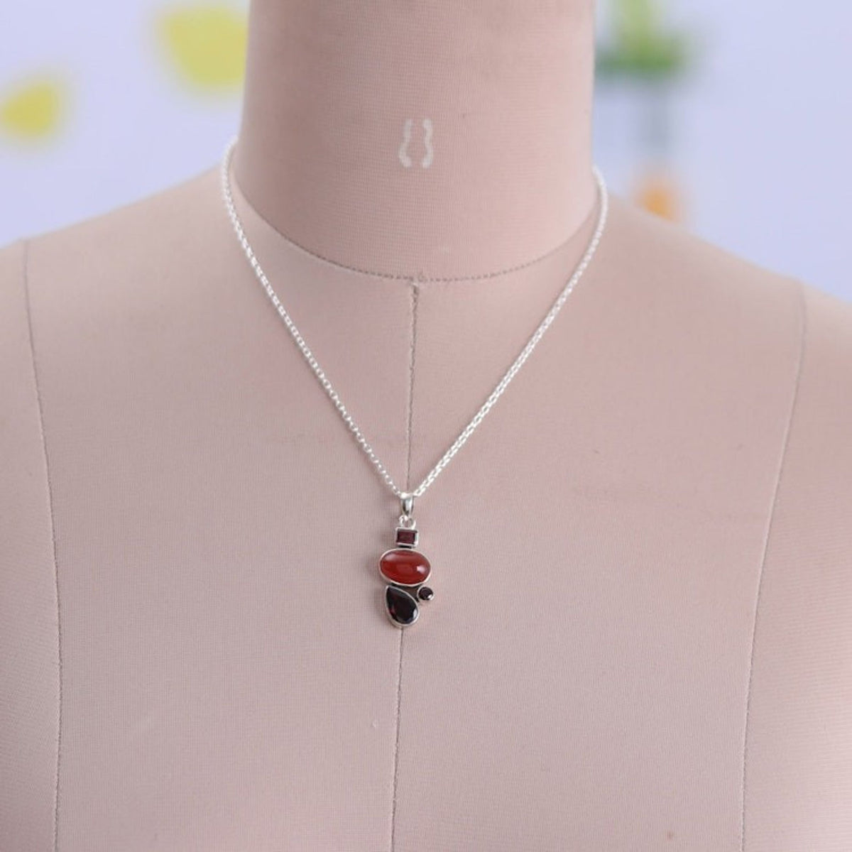Handcrafted in India from 925 sterling silver, garnet, and carnelian, with a combination finish. The necklace is 17.8 inches long with a 2 mm width. The pendant is 1.5 inches in length by 0.6 inches in width.