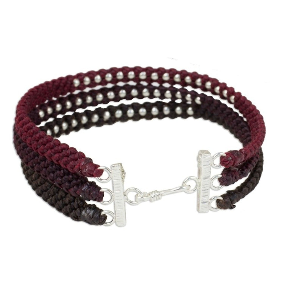 The 'Tricolor Moons' wristband bracelet by Napapat is a trendy accessory with silver beads that shine brightly among dark red, maroon, and dark brown strands. Napapat crafts the bracelet by hand with hill tribe stylizations and a sterling silver clasp. This piece is a beautiful blend of ethnic Thai influences with modern durability.