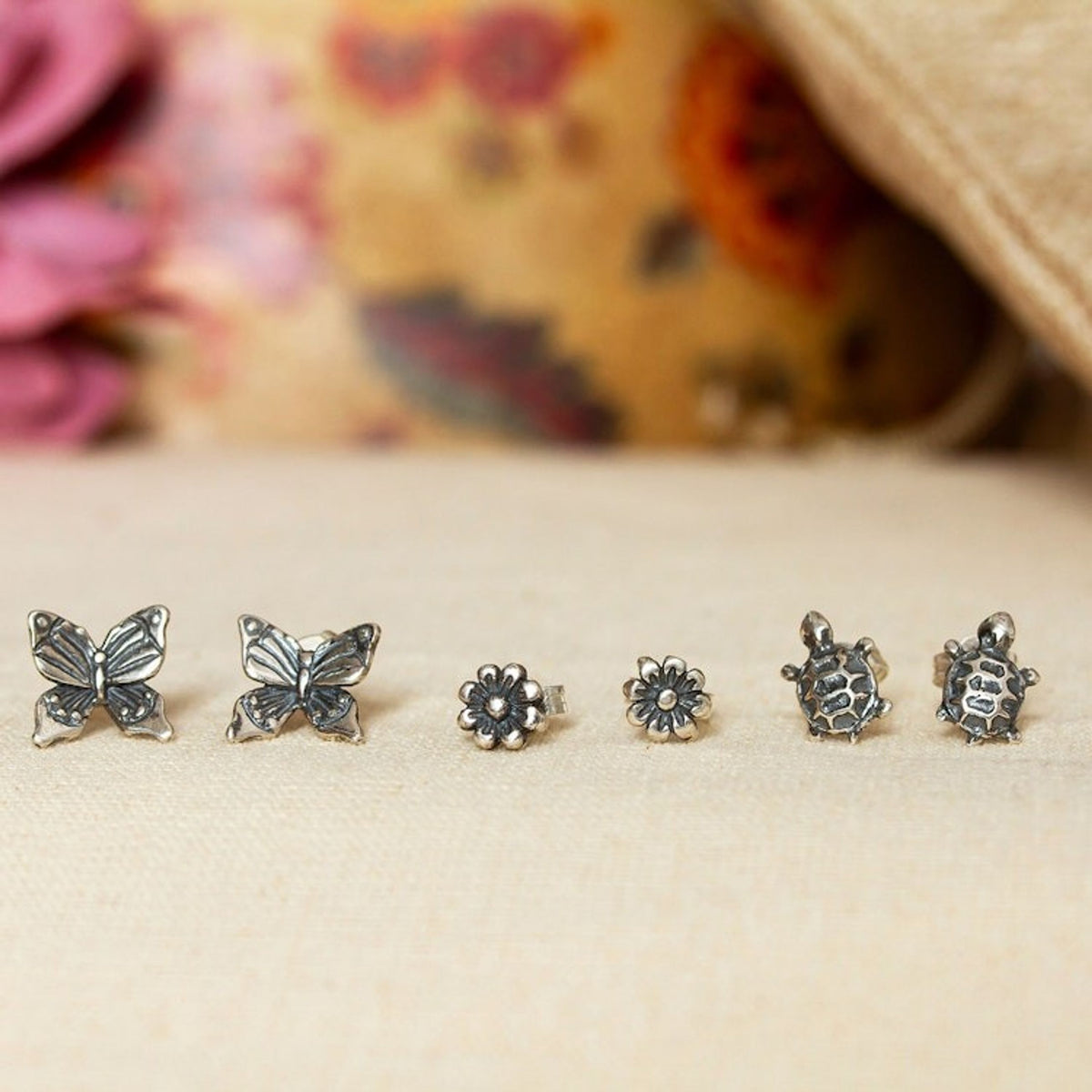 3-Piece Nature-Themed Sterling Silver Stud Earrings Set 'Bucklers of Nature'