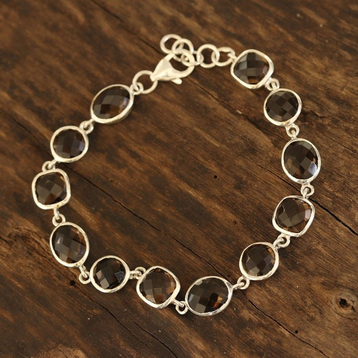 Handcrafted in India from 925 sterling silver and smoky quartz, with a high polish finish. The adjustable bracelet measures between 7.5 and 8 inches and features a lobster claw clasp.