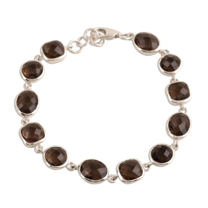 The 'Dazzling Princess' link bracelet by Neetu Barathi is a fabulous accessory designed with a high-polish finish. Faceted circles, ovals, and squares of lovely smoky quartz total over 30 carats, each framed by a link of sterling silver. This piece is a beautiful blend of tradition and modernity, using sterling silver and colorful gemstones.