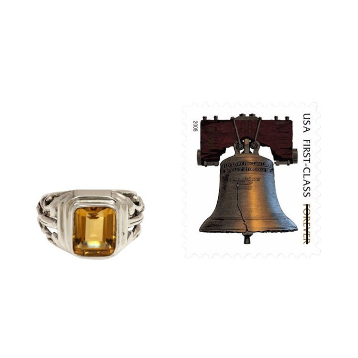 Handcrafted in Indonesia from sterling silver and citrine, with a combination finish. The ring's front measures 0.4 inches in length by 0.5 inches in width, and its band has a 3 mm width.