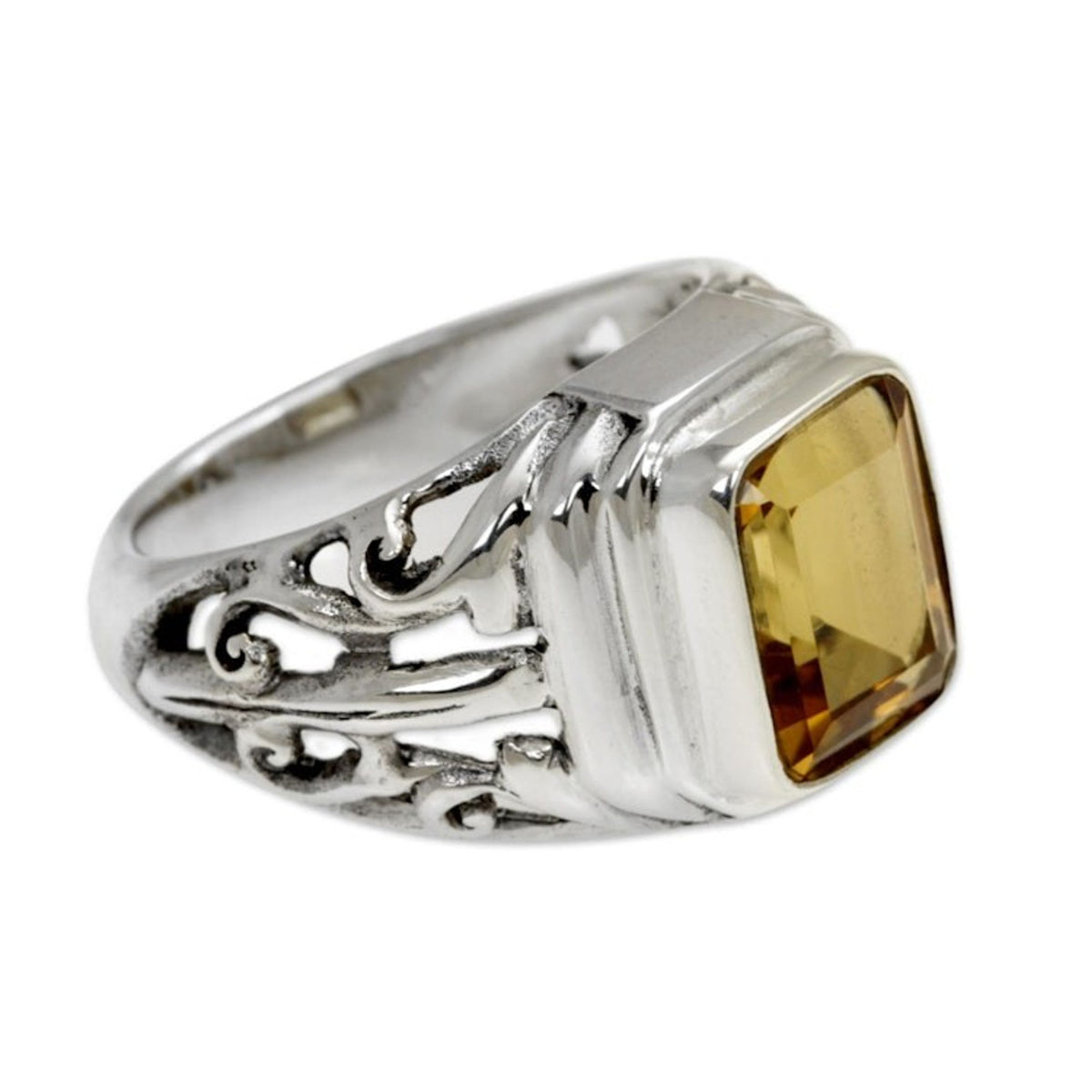 The 'Savannah Evening' ring by Nyoman Rena features sterling tendrils that embrace a golden gemstone. The dramatic ring, crafted from sterling silver, features a faceted citrine that totals 4 carats. This piece reflects the artist's dedication to creating handcrafted jewelry using traditional tools while being attuned to modern fashion trends.