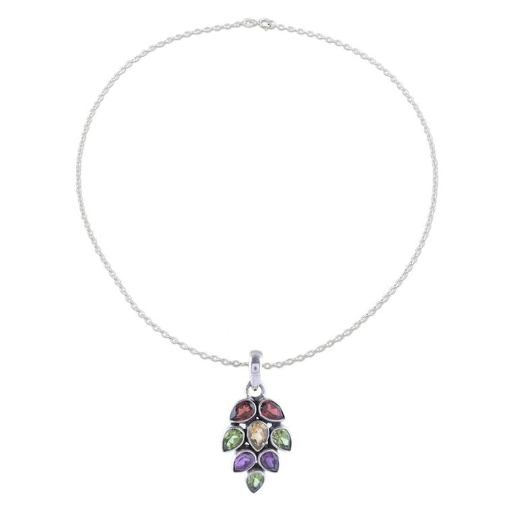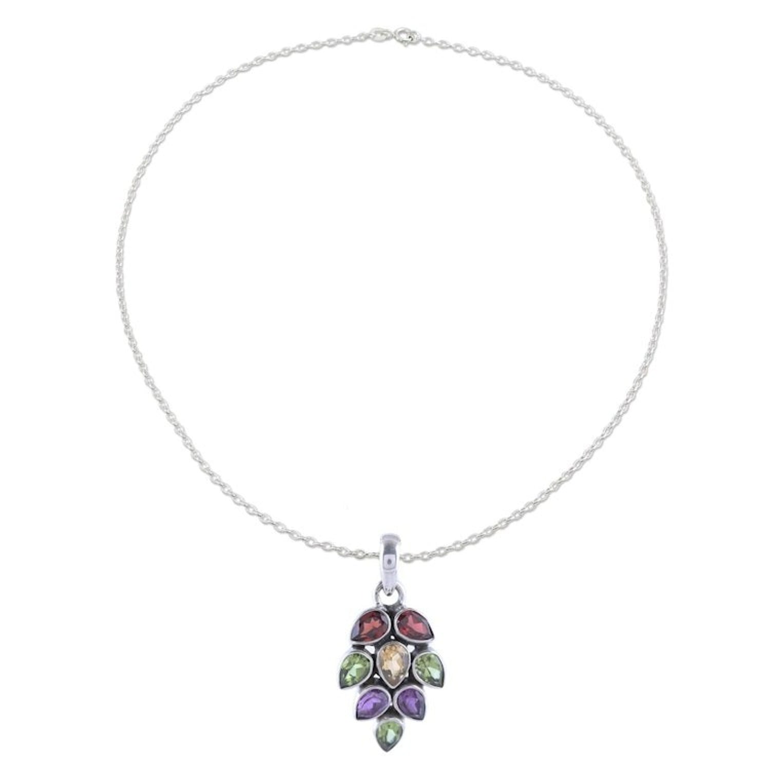 The 'Sparkling Pinecone' pendant necklace by Alok Jain features a colorful array of garnet, peridot, amethyst, and citrine that totals four carats. The pendant is framed by high-polish sterling silver. This fascinating necklace reflects the artist's dedication to creating designs that blend artistry with elegance.