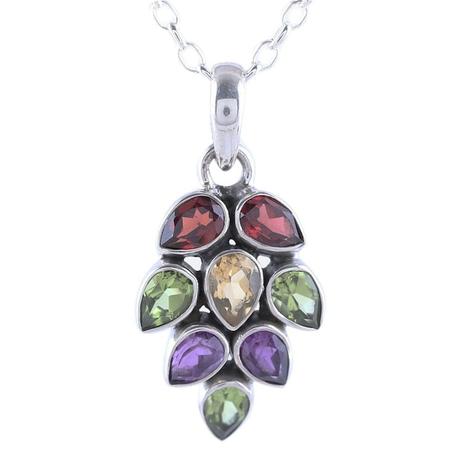 Handcrafted in India from 925 sterling silver and various gemstones, with a high polish finish. The necklace is 18 inches long with a 2 mm width. The pendant is 1.2 inches in length by 0.6 inches in width.