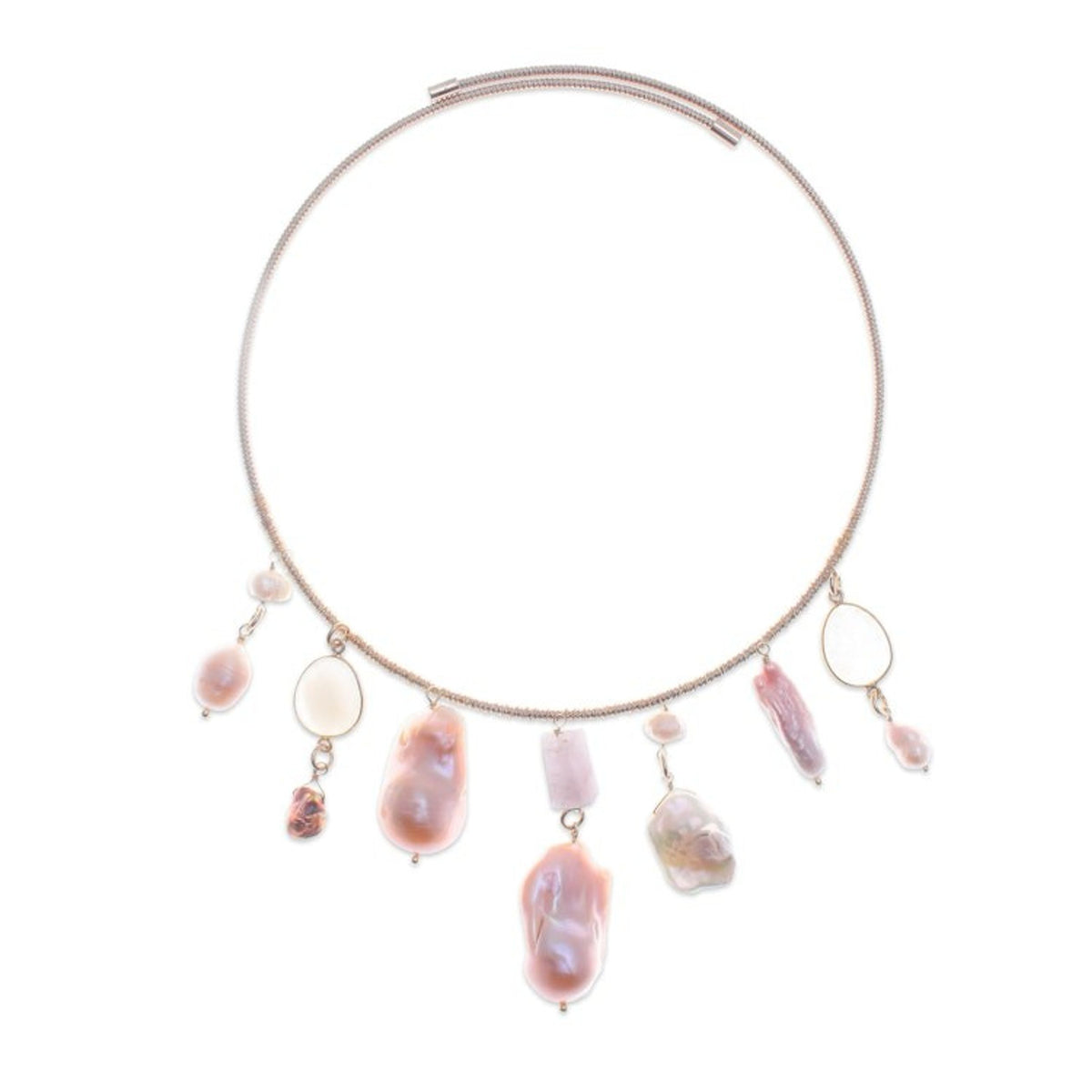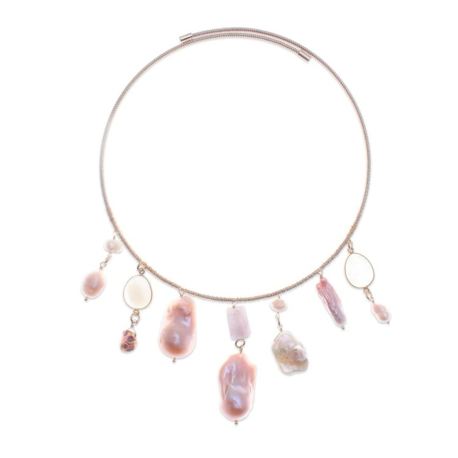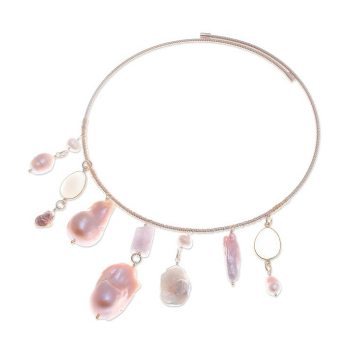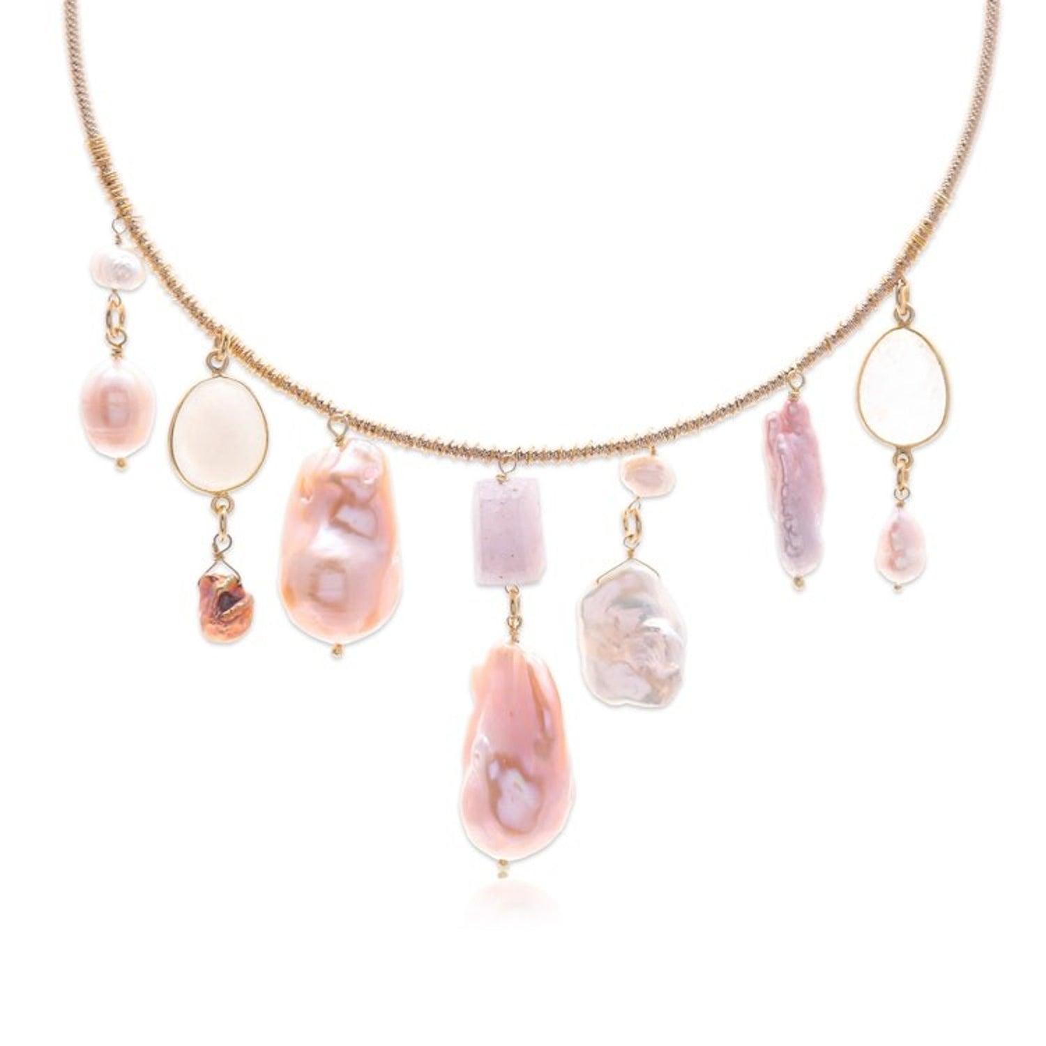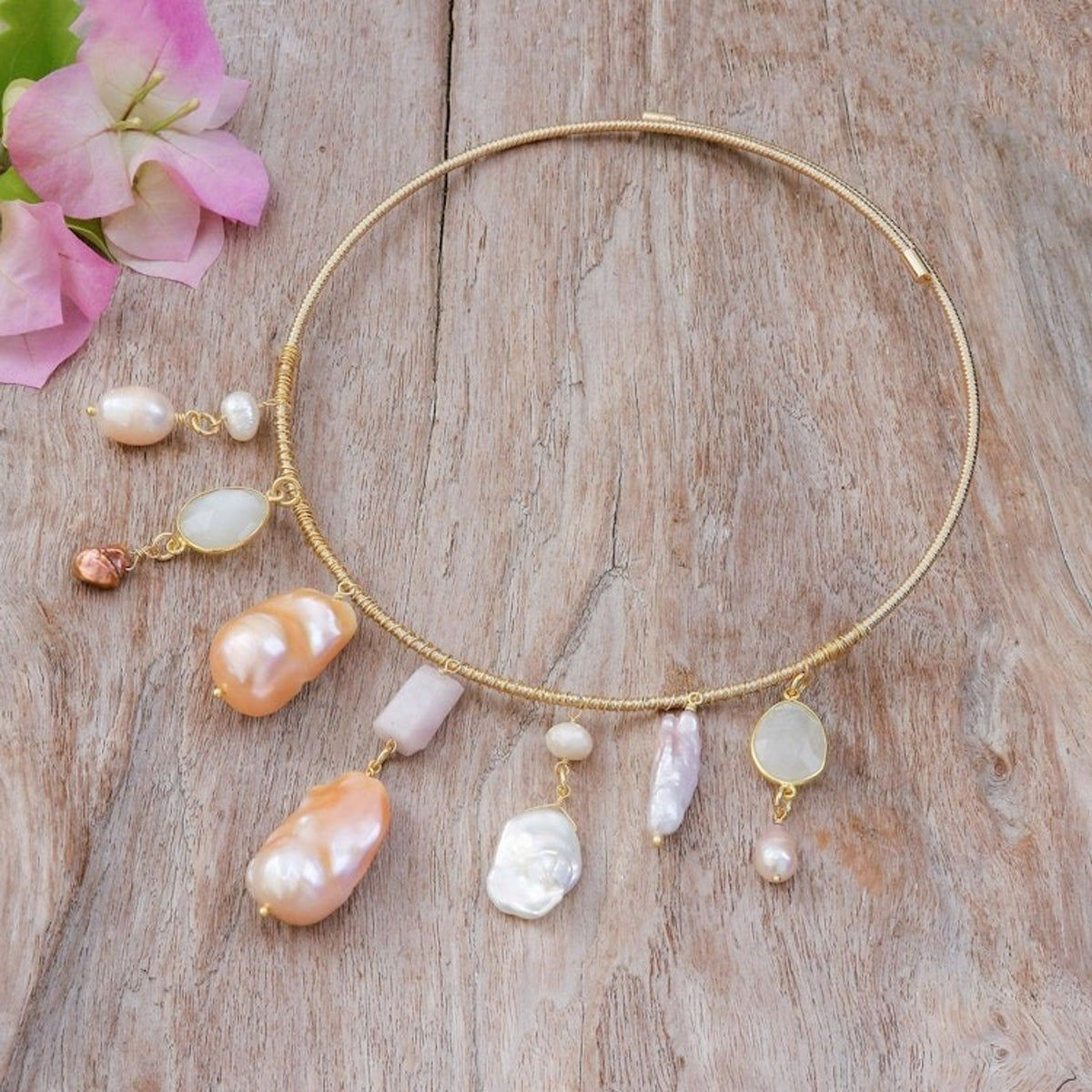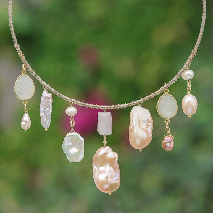 This 6-Carat 18k Gold-Plated Pink Multi-Gemstone Collar Necklace 'Pop of Pink' by Independent Artisans is a sublime and elegant statement piece designed by Thai artisan Saranarat Ratanaporn. This necklace redefines bold sophistication, featuring a sweet symphony of colors with vibrant cultured pearls in pink, white, peach, and brown hues. The pearls are artfully threaded alongside charms of natural moonstone and kunzite, with the stones totaling six carats. Inspired by fashion trends and the organic beauty of gemstones, this piece embodies creativity and meticulous handwork, offering a distinctive and wearable design that reflects the individuality of nature's treasures.