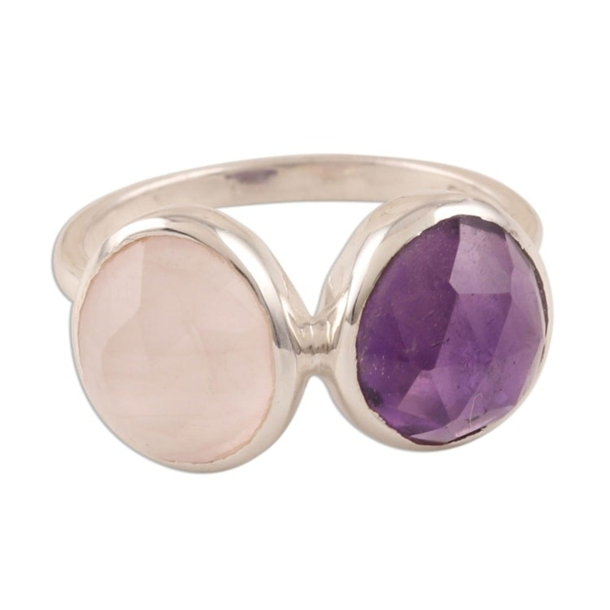 Handcrafted in India, this ring is made from high-polish 925 sterling silver with faceted amethyst and rose quartz gems totaling seven carats. The ring front measures 0.4 inches L x 0.7 inches W, with a band width of 2 mm.