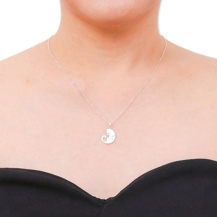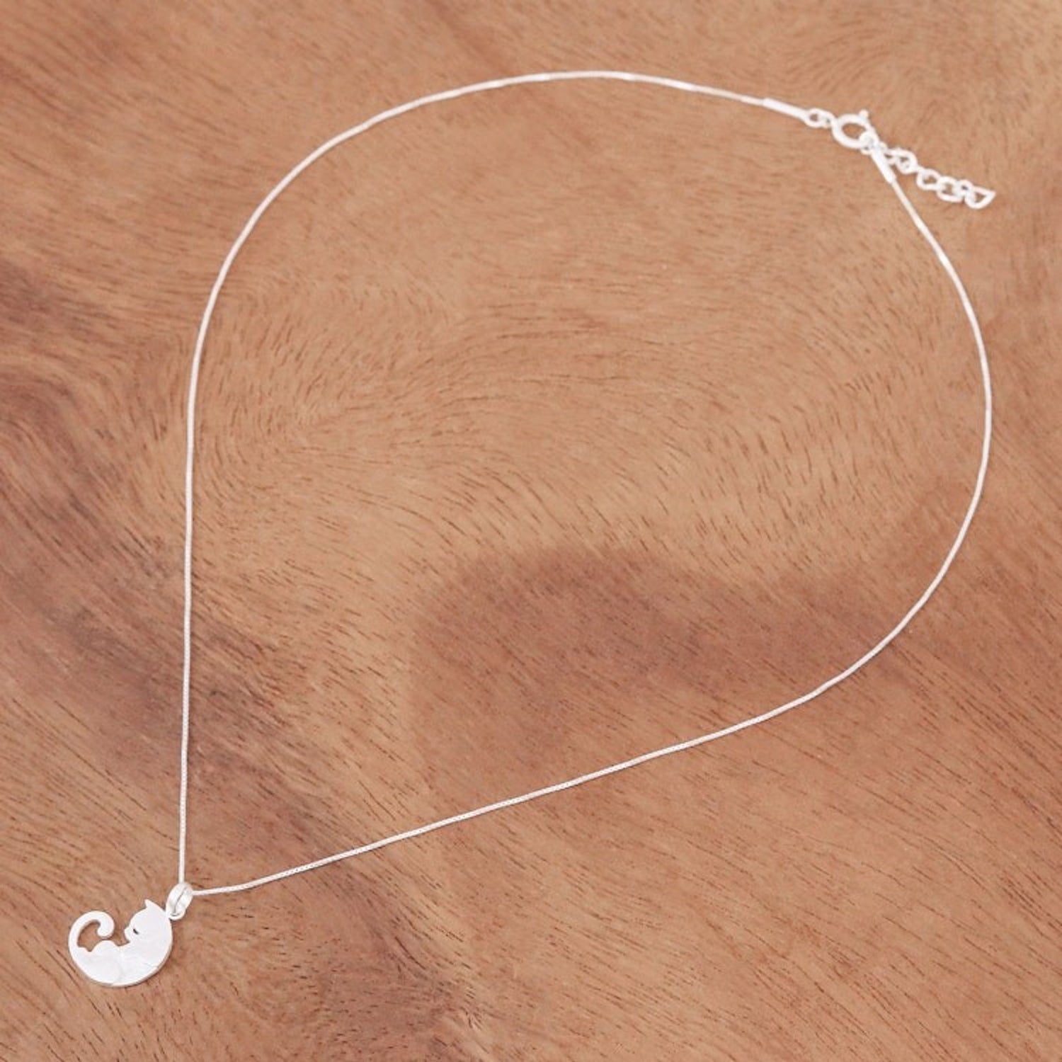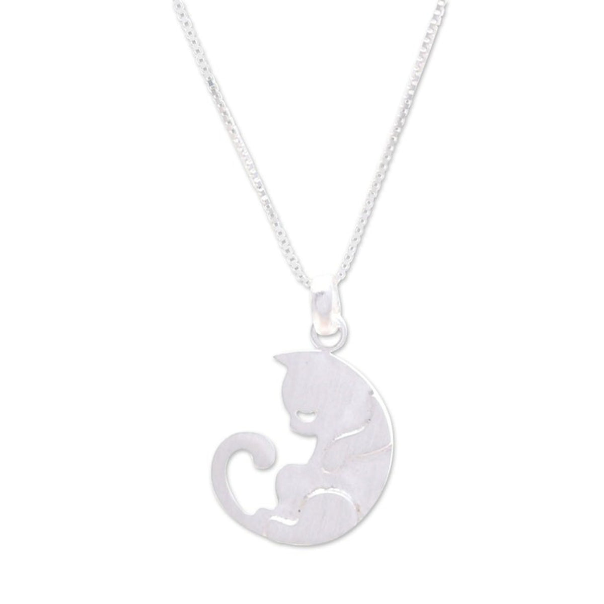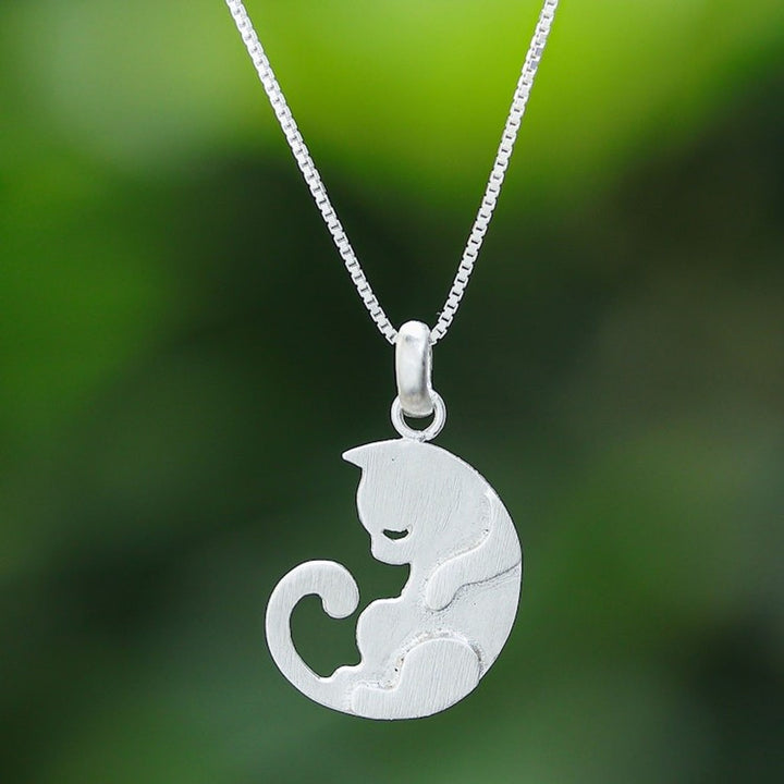 This 925 Silver Cat Pendant Necklace with Brushed-Satin Finish 'Lazy Cat' by Independent Artisans is a charming and whimsical piece designed by Jantana. Inspired by her family’s legacy of silversmithing, this necklace features a cute cat sleeping with its back curled in the shape of a crescent moon. The sterling silver pendant boasts a stunning brushed-satin finish that gives it a unique, subtle elegance. A perfect accessory for feline enthusiasts, this piece balances delicacy with a modern appeal, reflecting Jantana’s personal style and her joy in sharing beauty with the world.