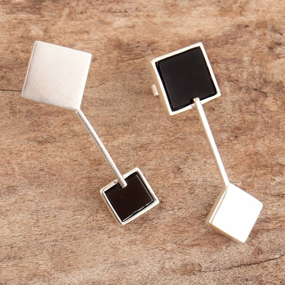 These 925 Sterling Silver and Onyx Drop Earrings 'Possibilities' by Independent Artisans are a gorgeous and elegant creation by Leslie Granthon. With a background in design and a passion for sculptural silver, Leslie has created these earrings to reflect both spontaneity and precision. The geometric design is enhanced by polished onyx pendants and silver accents, adding a charming and sophisticated touch. This versatile pair is perfect for any occasion, embodying Leslie's belief that jewelry is both sanctuary and expression. They serve as a tangible connection to art, culture, and imagination for the wearer.