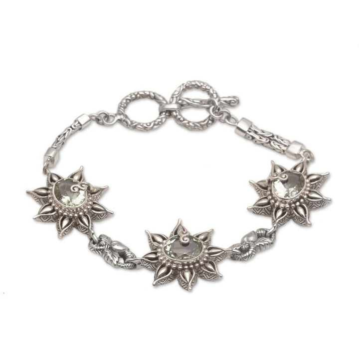 This 925 Sterling Silver Floral Green Prasiolite Link Bracelet 'Prasiolite Garden' by Independent Artisans is an eye-catching and beautiful piece by Kadek Hendra. As a third-generation silversmith, he blends ancestral artistry with modern design to create a bracelet that feels both personal and timeless. This link bracelet features seven carats of pale green prasiolite, evoking a serene and delicate garden. The combination of finishes and the adjustable toggle clasp make it a perfect accessory for any occasion. This piece is a testament to Kadek’s perfectionism and his dedication to preserving Balinese traditions.