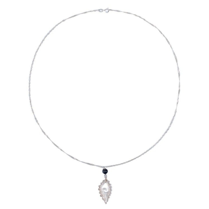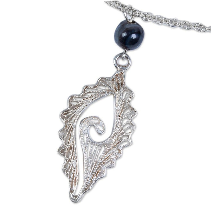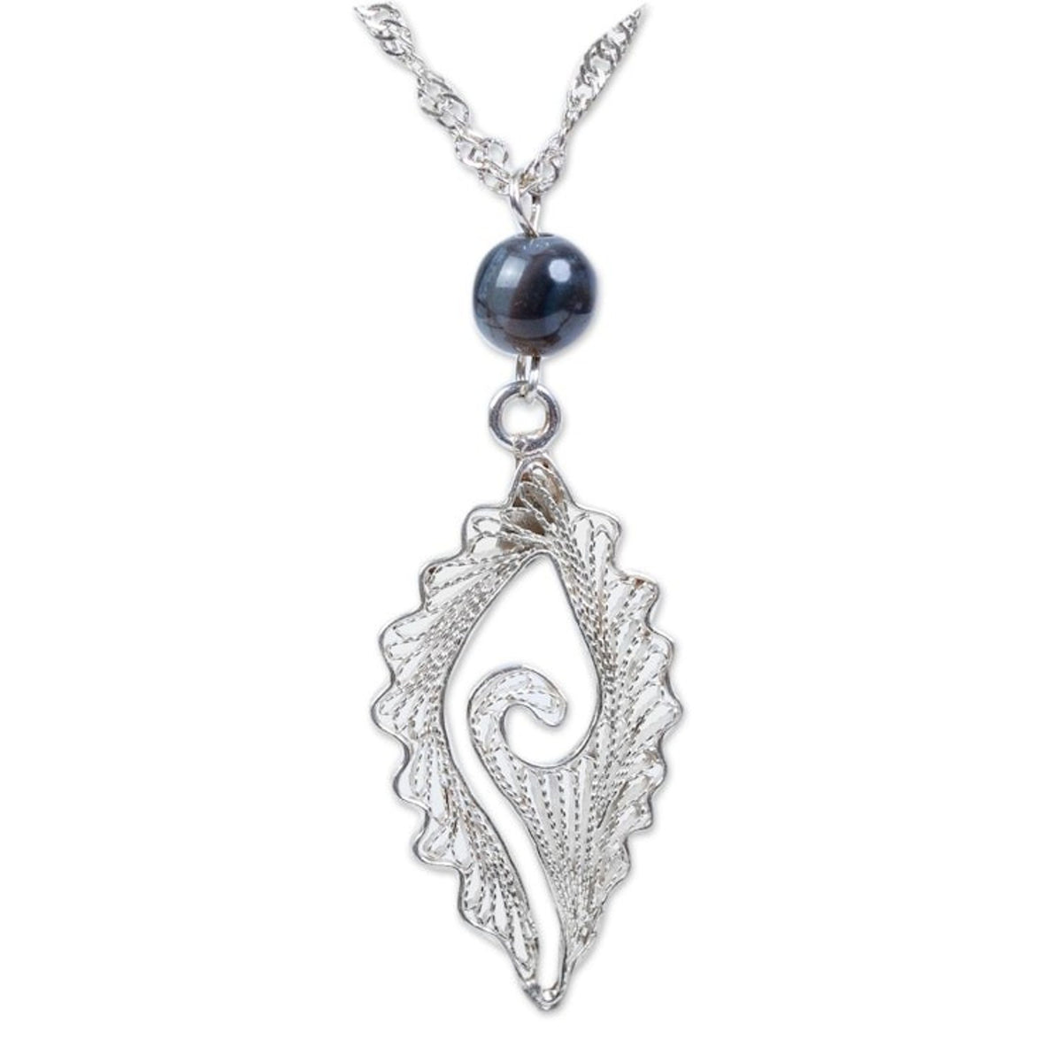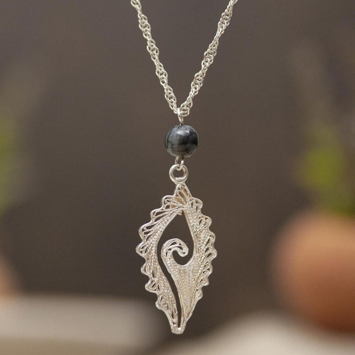This 925 Sterling Silver Necklace with Filigree Pendant and Agate 'Filigree Snail' by Independent Artisans is a unique and nostalgic piece by Eva Souto, who is devoted to preserving Mexico’s rich filigree traditions. The necklace features a traditional filigree pendant in the shape of a snail, blended with a modern design sensibility. The delicate sterling silver work is beautifully contrasted by a polished agate bead, creating an elegant and striking look. This piece is a testament to the artist’s commitment to reviving an art form at risk of disappearing, offering a tangible connection to Mexico's cultural significance and a timeless sense of human symbolism.
