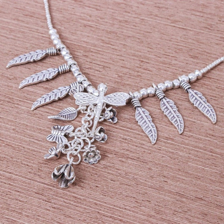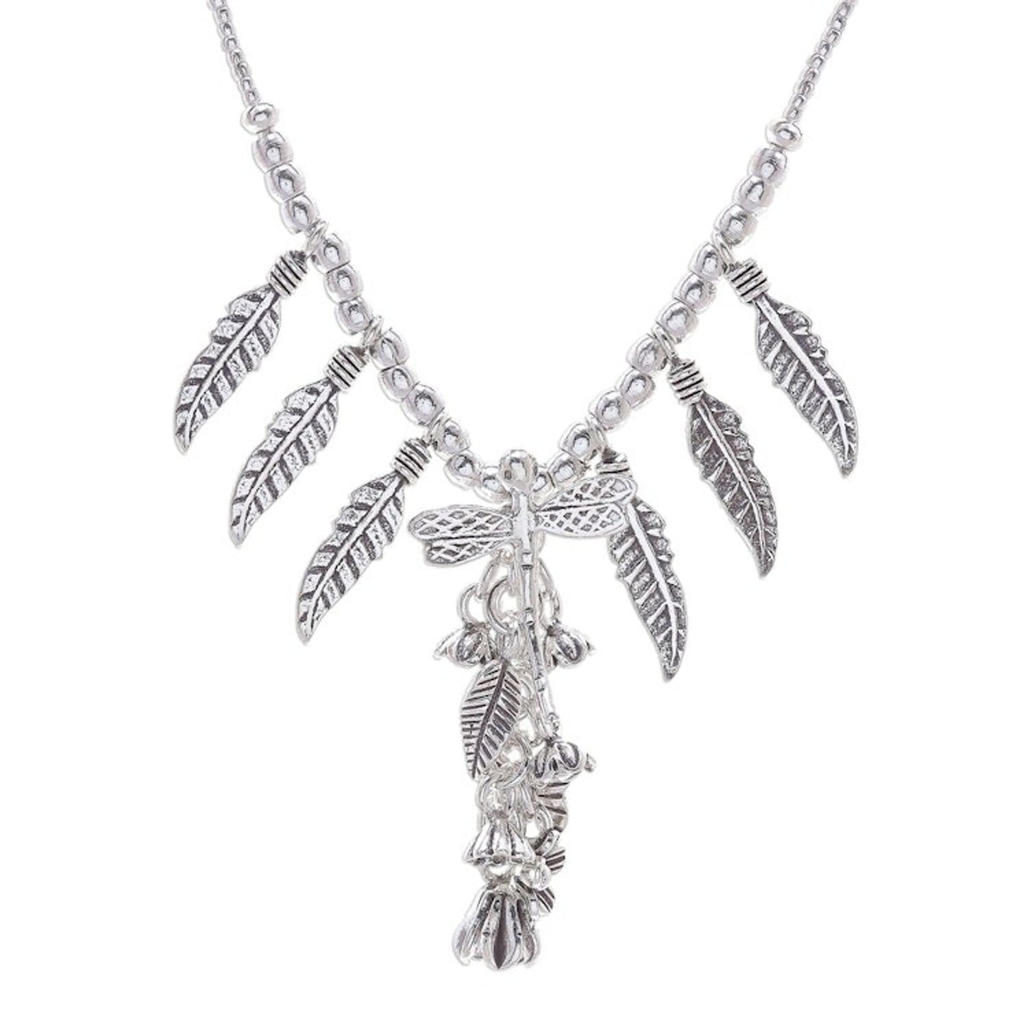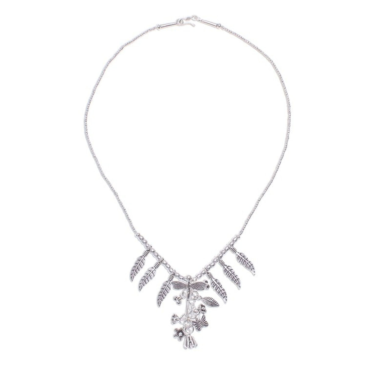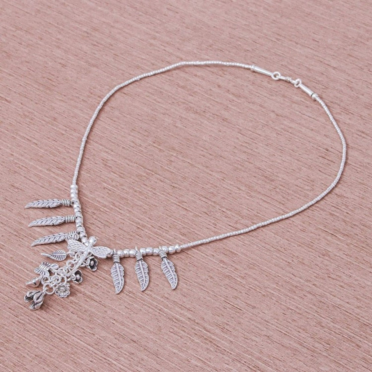 This 950 Karen Silver Dragonfly Charm Y-Necklace 'Lady Dragonfly' by Independent Artisans is a beautiful and meaningful piece by Pakaon Sojintarit. The necklace features a stunning dragonfly pendant, a symbol of wisdom, transformation, and adaptability. The dragonfly's body is a chain of handmade Karen 950 silver beads, and its wings are hand-stamped and oxidized for contrast. Below the dragonfly, the necklace splits into two short strands with flower and leaf charms, serving as a reminder to make room for joy in life. This piece beautifully combines a global outlook with a deep appreciation for her heritage and the traditions of hill tribe silver.