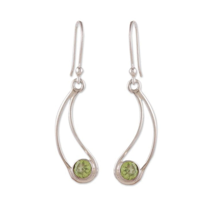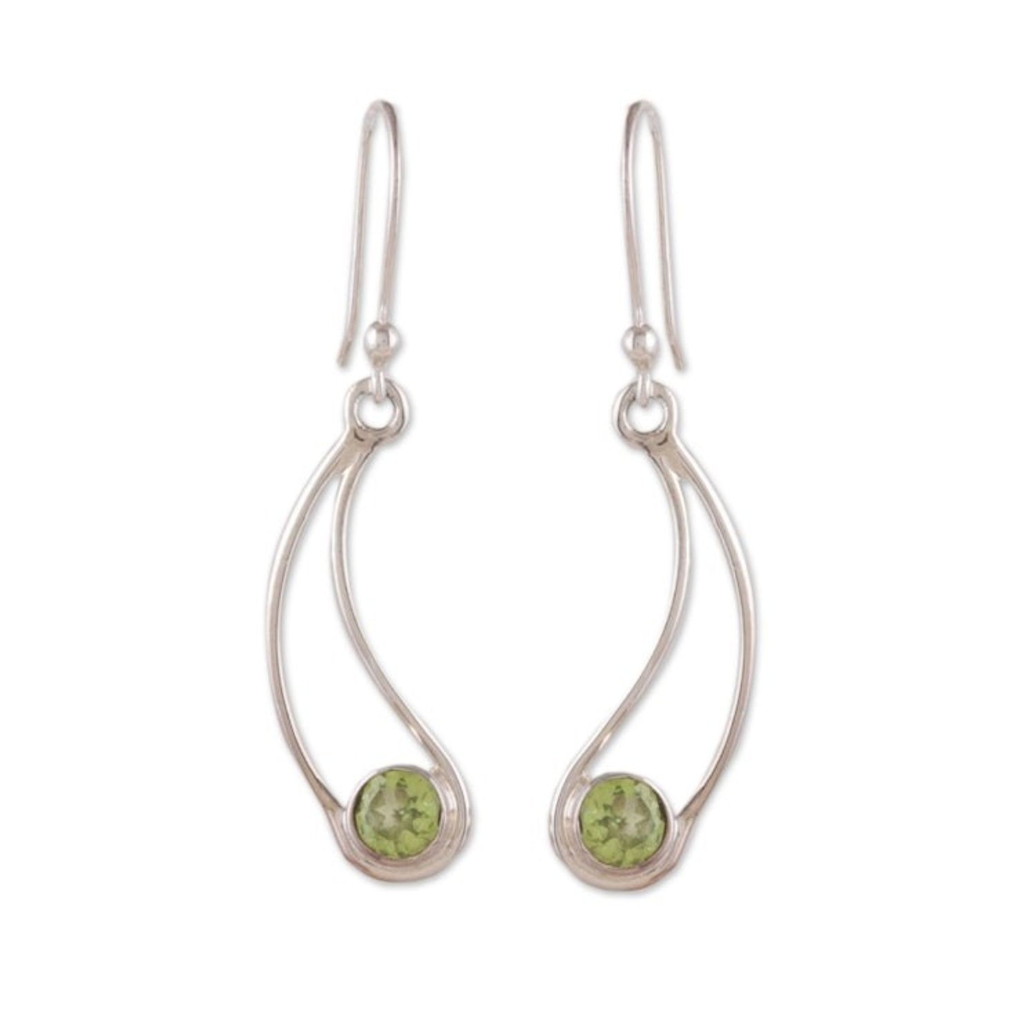 Handcrafted in India, these earrings are made from high-polish 925 sterling silver with peridot stones. They measure 1.7 inches L x 0.3 inches W x 0.2 inches D and secure with hook clasps.