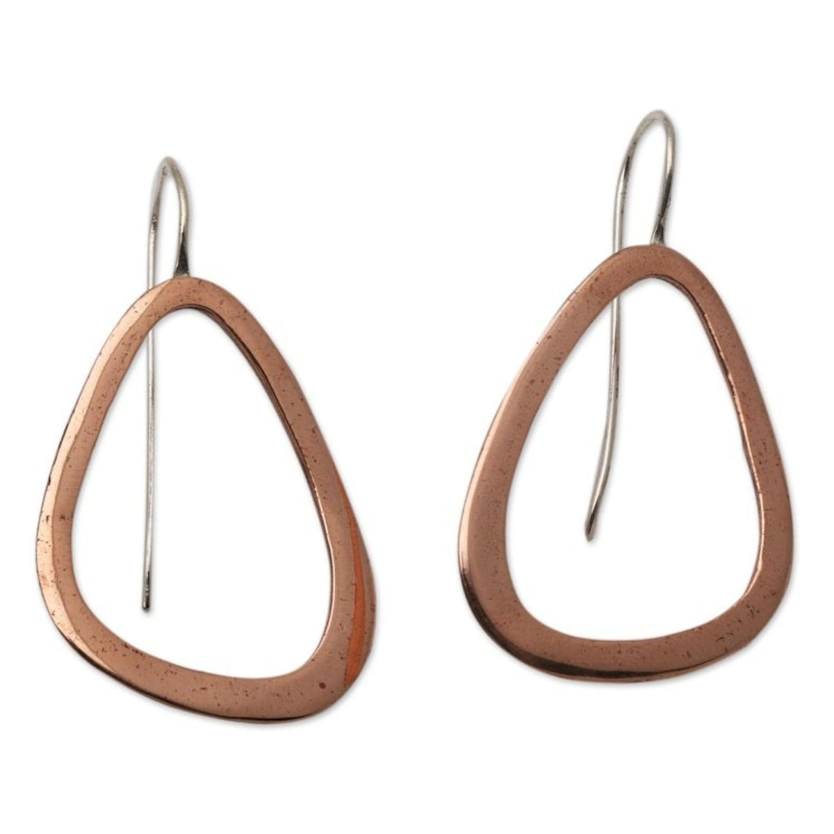 These Abstract Copper Drop Earrings with Sterling Silver Hooks 'Delightful Abstraction' are designed by Balinese artisan Nyoman Nartawan. These delightful, abstract earrings feature two rounded shapes handcrafted from gleaming copper, which gracefully drop below hooks of sterling silver. The combination of metals creates a distinctive contrast, while the design itself showcases his ability to blend traditional Balinese silversmithing with contemporary trends. These earrings are a testament to his dedication and the enduring legacy of Bali’s metalwork.