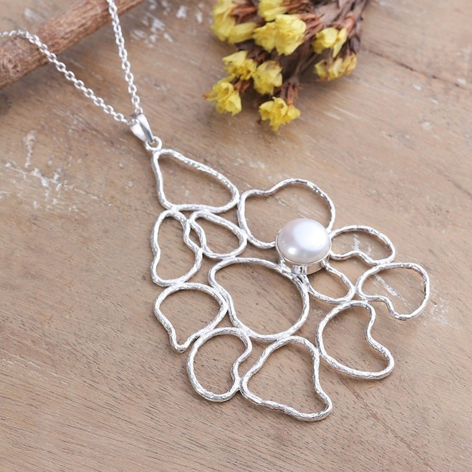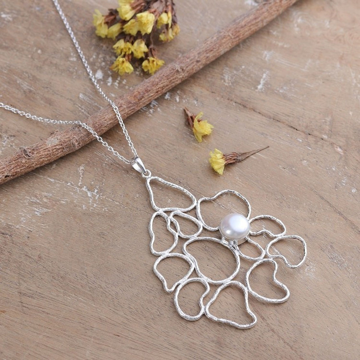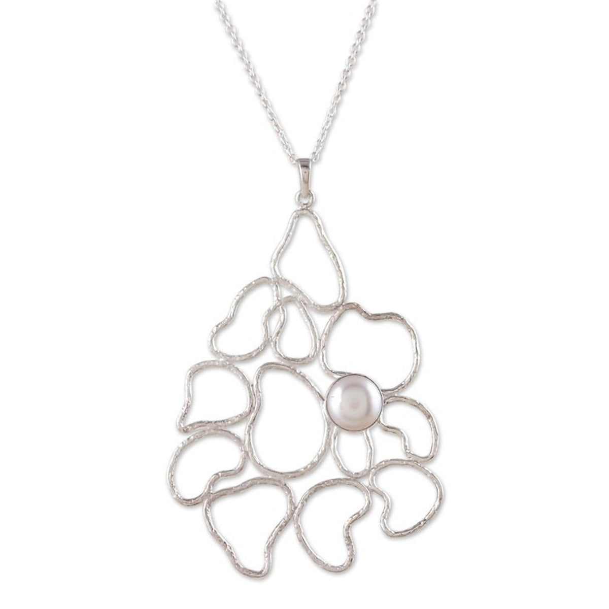 Abstract Floral Sterling Silver Pendant Necklace with Pearl 'Oneiric Petals'
