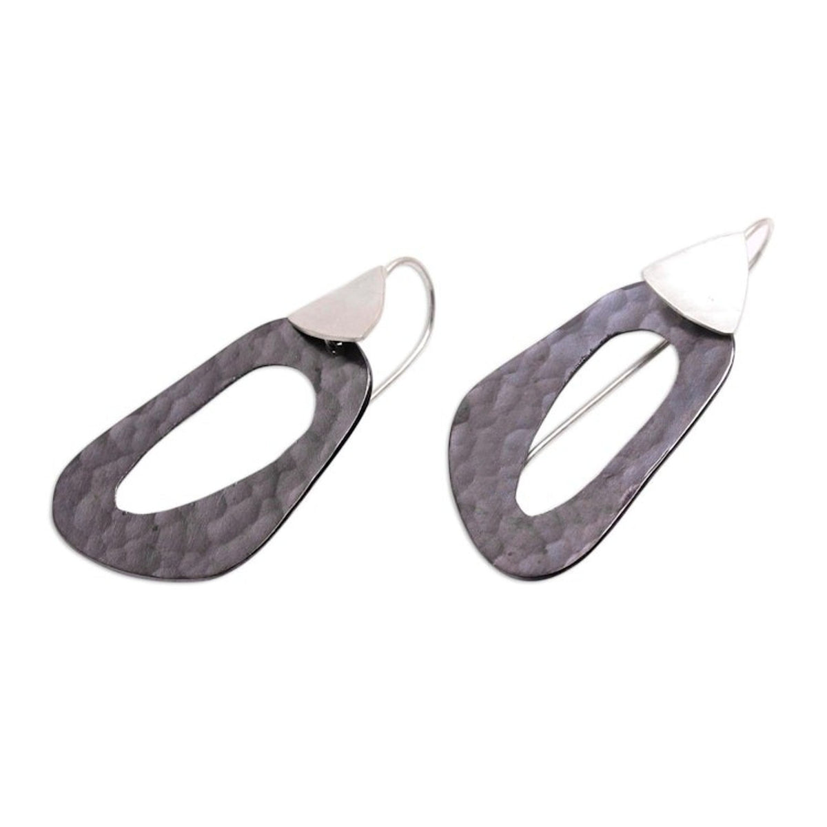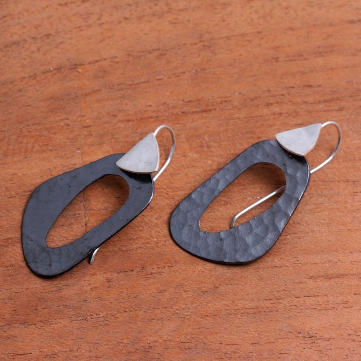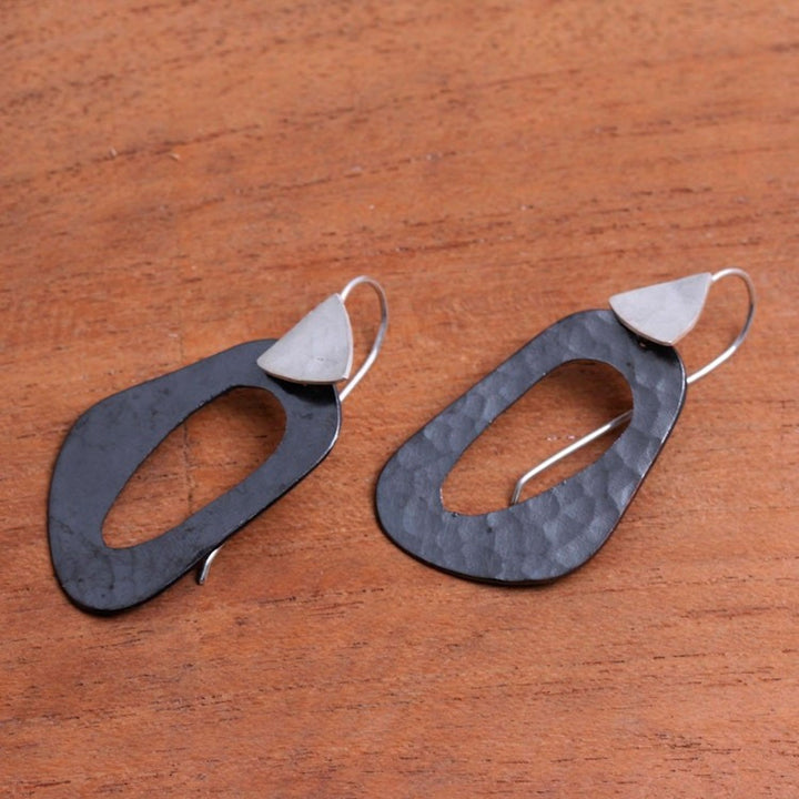 These Abstract Sterling Silver and Dark Copper Dangle Earrings 'Dark Lakes' are a modern and striking piece by Nyoman Nartawan. Handcrafted from copper with a darkly oxidized finish, two abstract shapes with openwork dangle gracefully. The contrast between the dark copper and the sterling silver hooks creates a bold and contemporary look. This piece is a perfect example of his ability to achieve distinctive contrasts by combining different metals, offering jewelry that reflects resilience, artistry, and the enduring legacy of Bali’s metalwork.