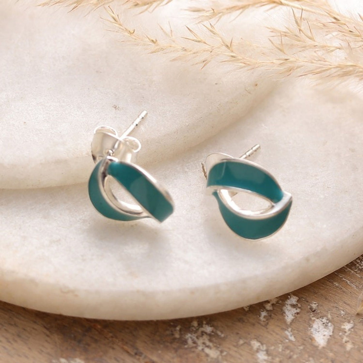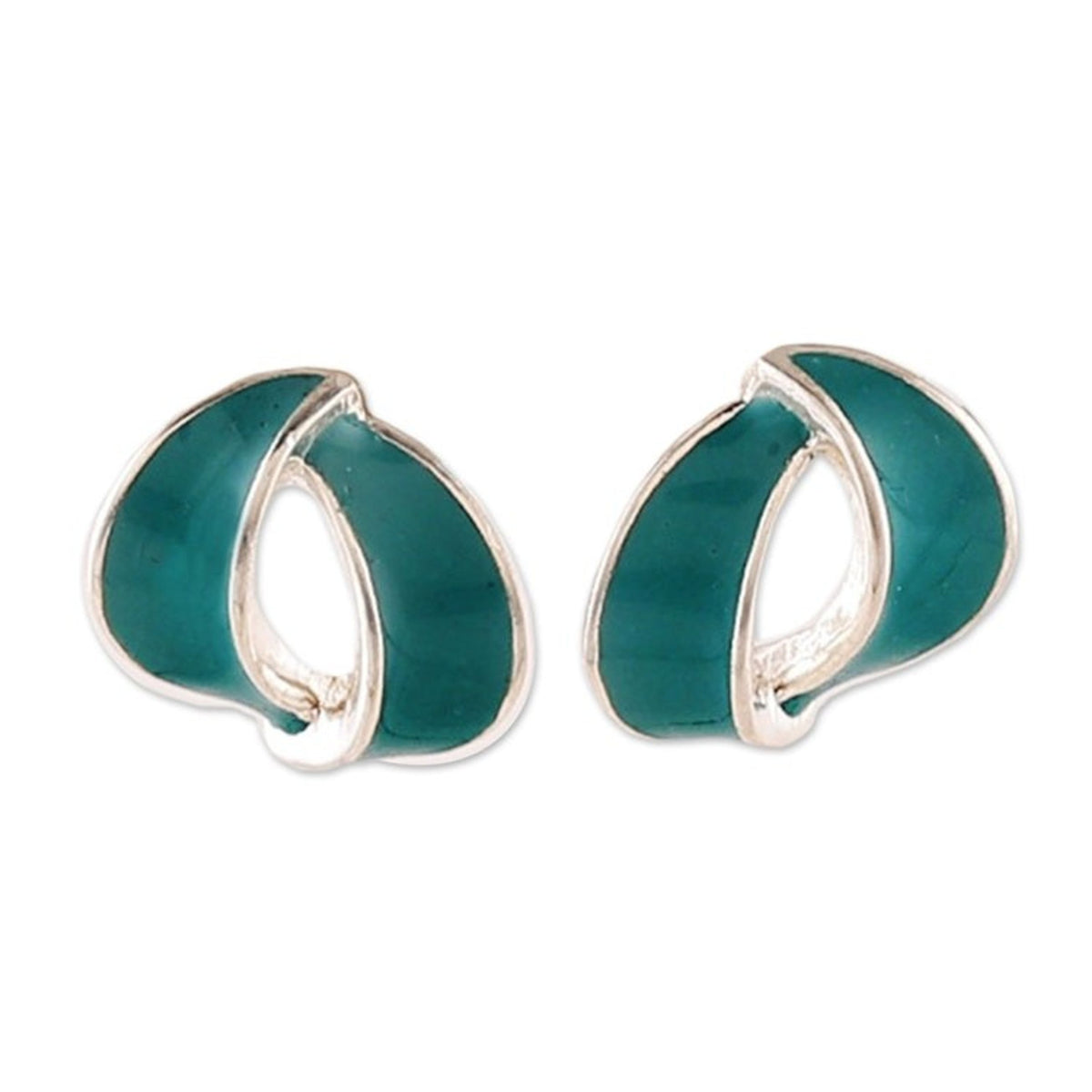 Handcrafted in India, these earrings are made from high-polish 925 sterling silver with blue enamel paint. They measure 0.4 inches L x 0.4 inches W and secure with post clasps.