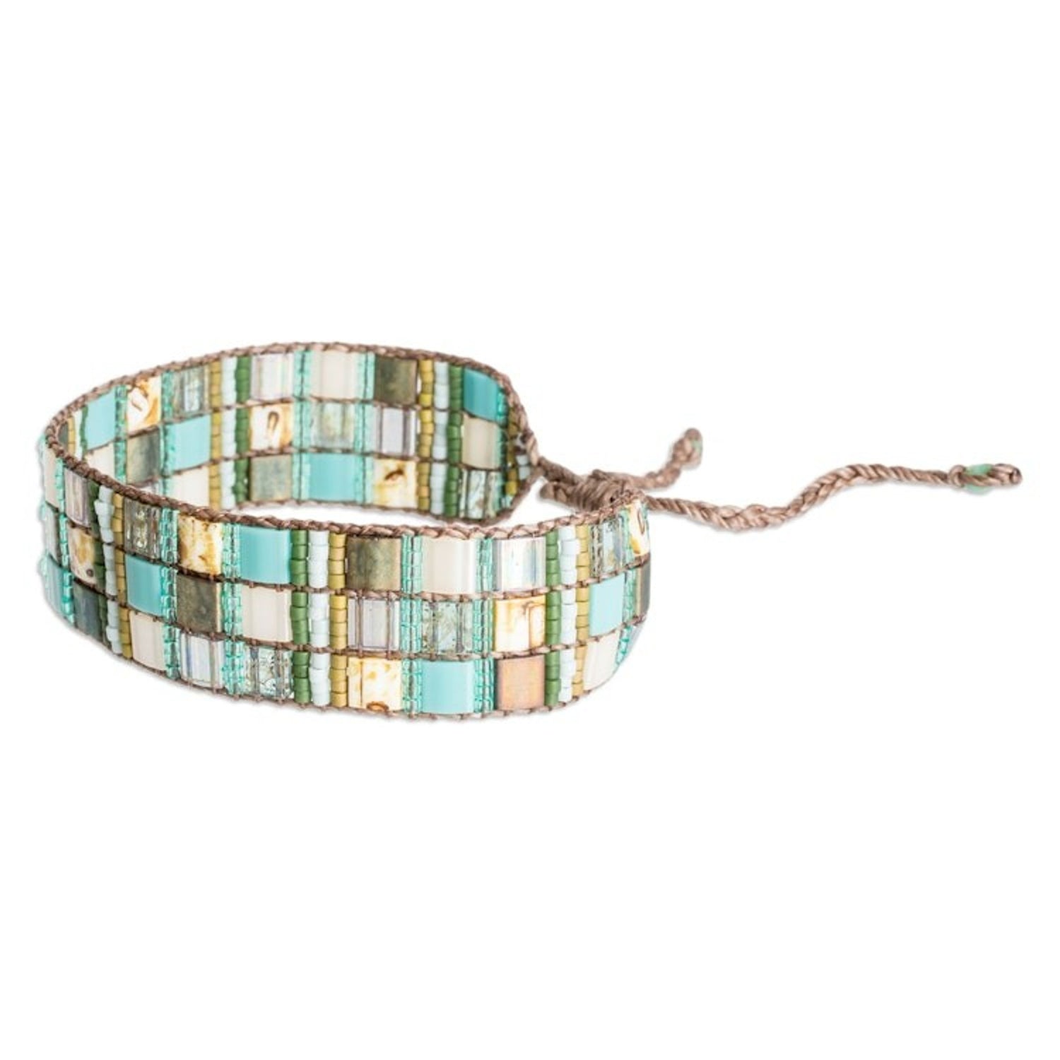 Adjustable Green Aqua Mosaic Glass Beaded Wristband Bracelet 'Magical Mosaic'