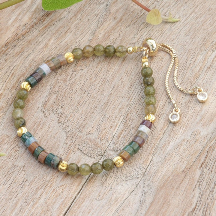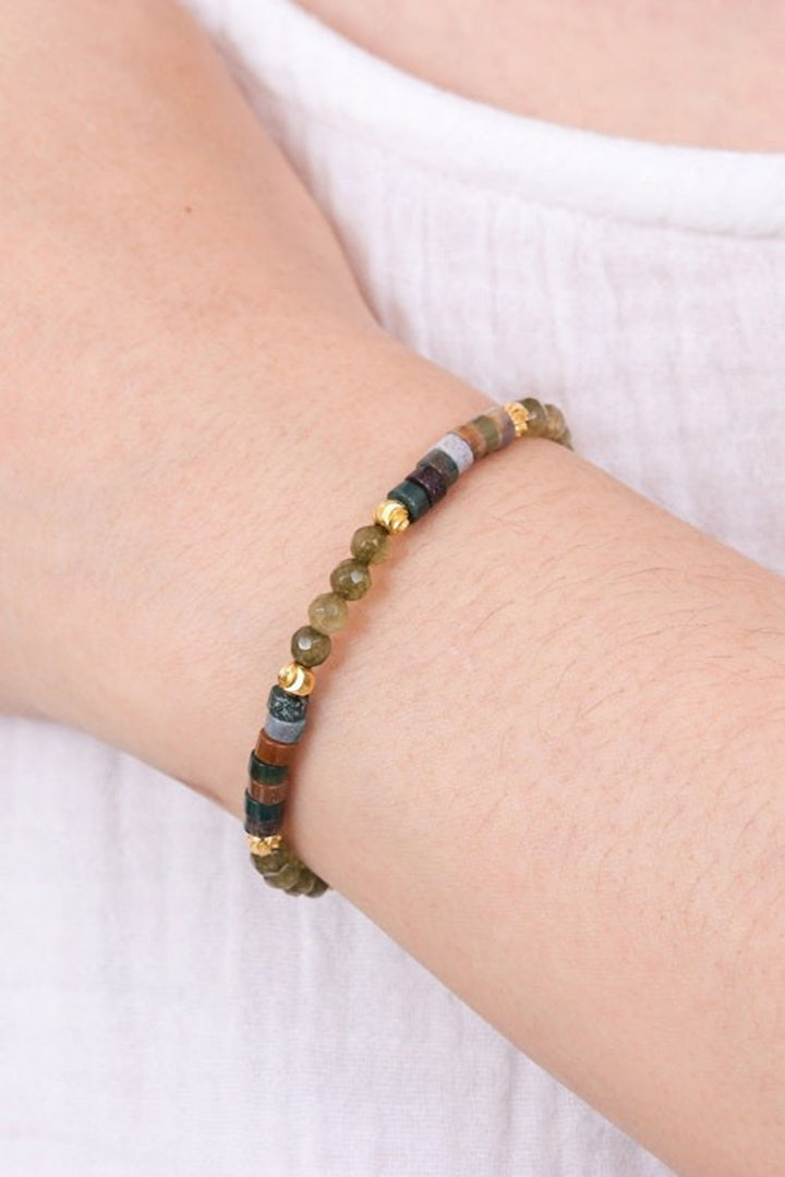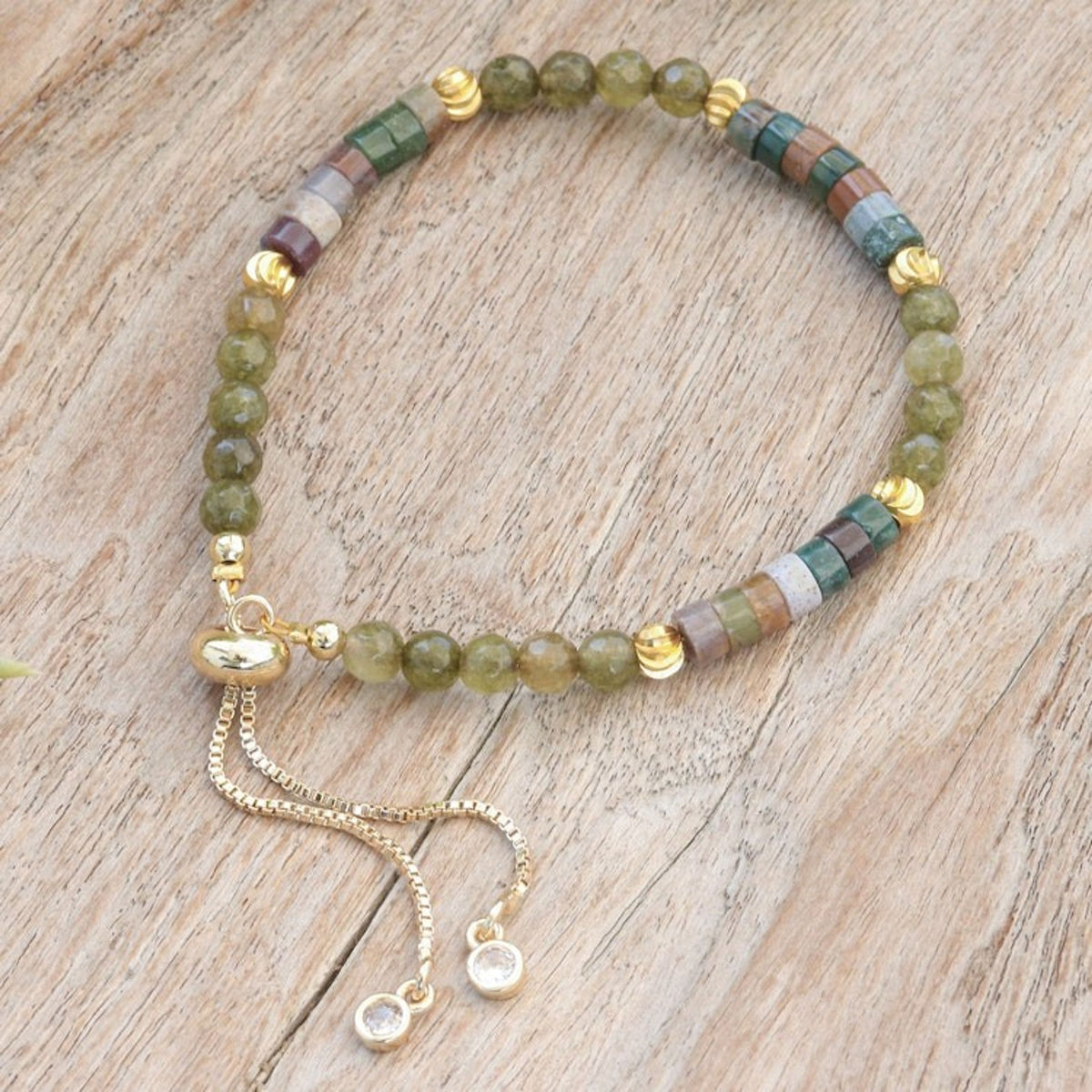 Handcrafted in Thailand, this bracelet is made from agate, quartz, and brass beads. It features a combination finish, an adjustable length from 6 to 8.8 inches, and a sliding knot closure. The beaded section measures 6.3 inches W.