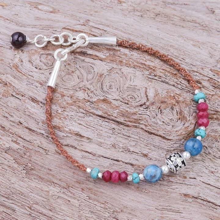 This Agate and Quartz Beaded Cord Bracelet with Sterling Silver 'Wonder' is a striking piece by Samart Takham and his daughter. The beaded cord bracelet features a flower-adorned sterling silver bead at the center, flanked by polished and faceted beads of agate, quartz, and reconstituted turquoise. A polished natural garnet bead adorns the end of the extender chain. The design is a beautiful blend of traditional and modern artistry, reflecting the preservation of generational knowledge and the spirit of Thai heritage and family artistry.