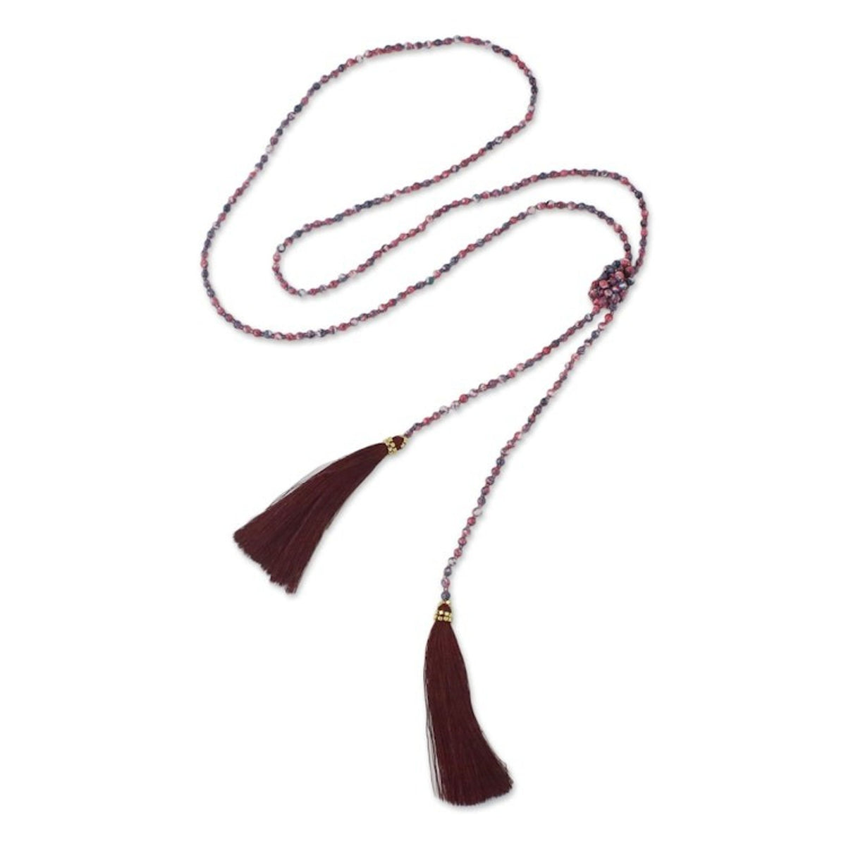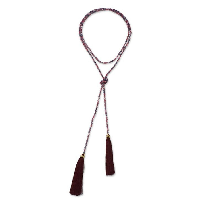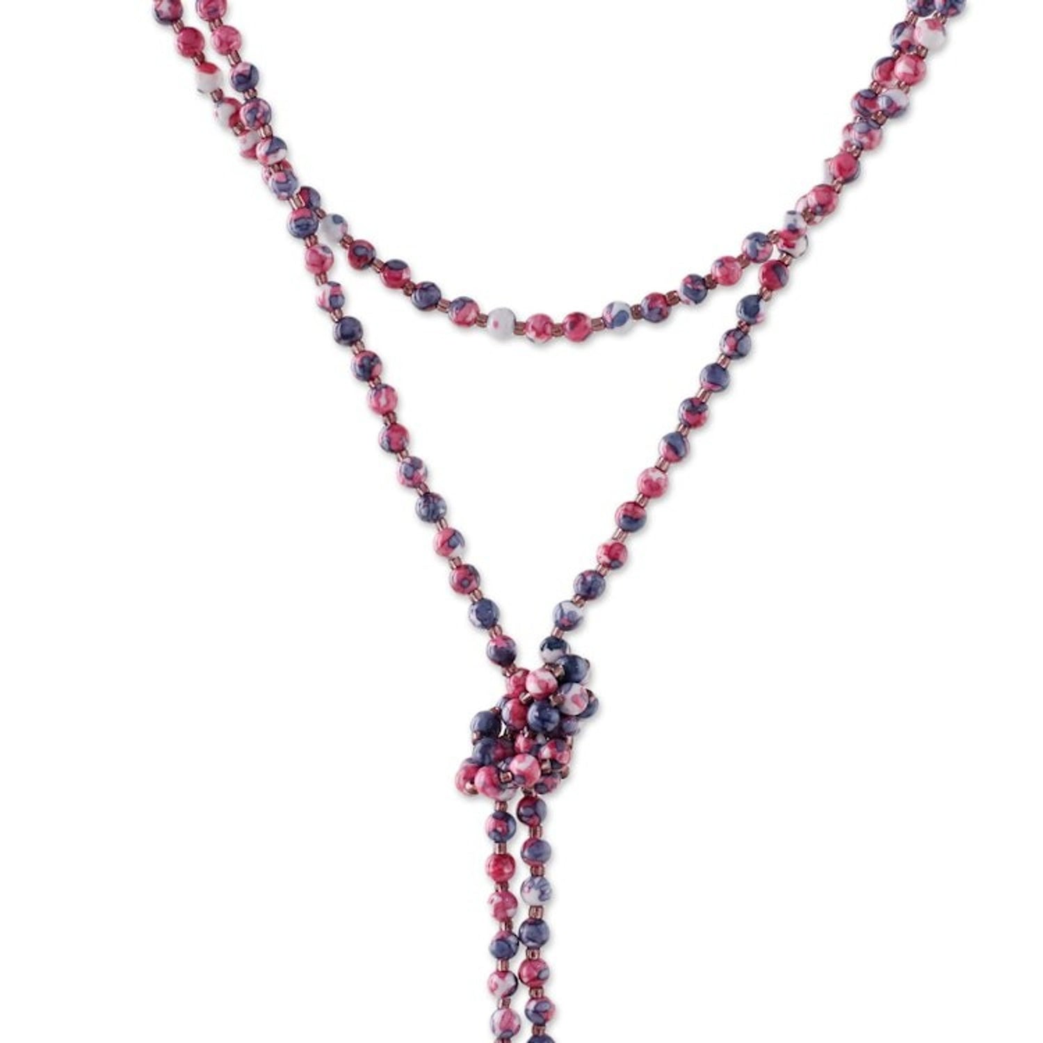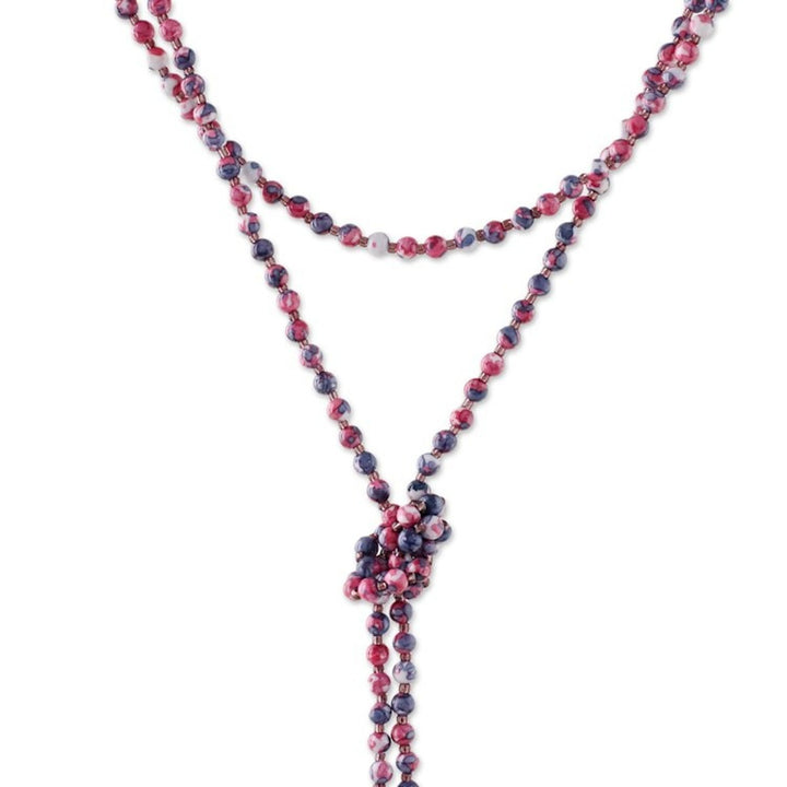 This Agate Beaded Lariat Necklace in Dark Red from Thailand 'Festive Holiday in Dark Red' is a vibrant accessory by Nareerat. The lariat necklace is beaded with agate beads in tones of pink and purple, alternating with petite clear glass beads. A knot pendant at the front culminates in dark red cotton tassels with brass beads, creating a festive look. This piece is a testament to her dedication to handcrafted jewelry that celebrates the beauty of color and nature.
