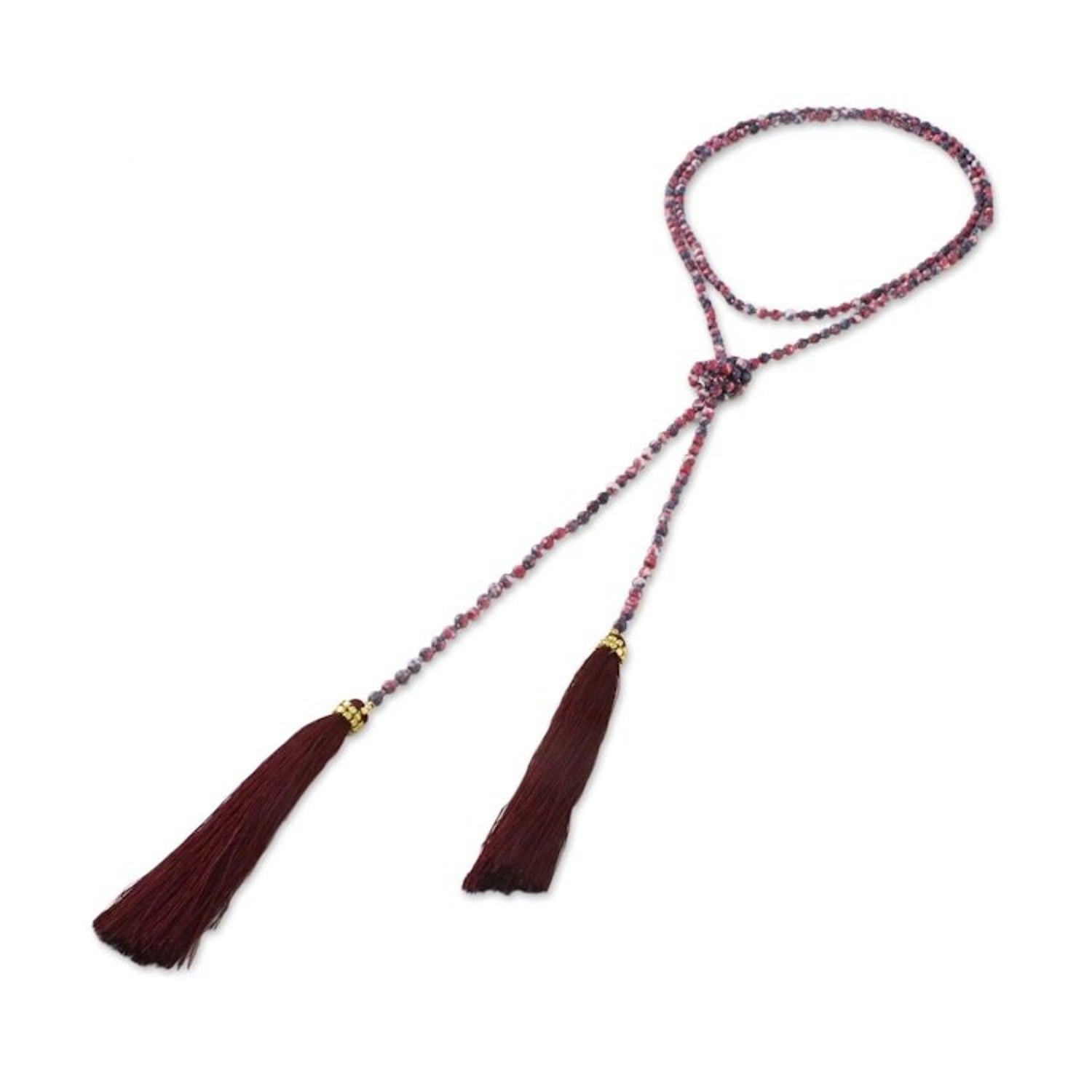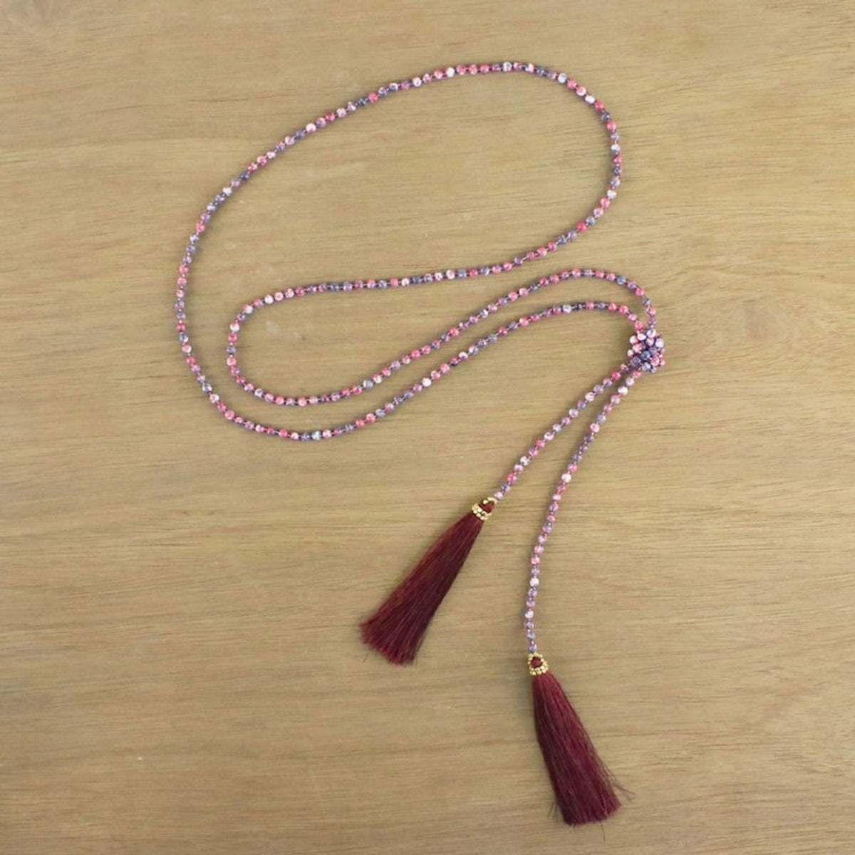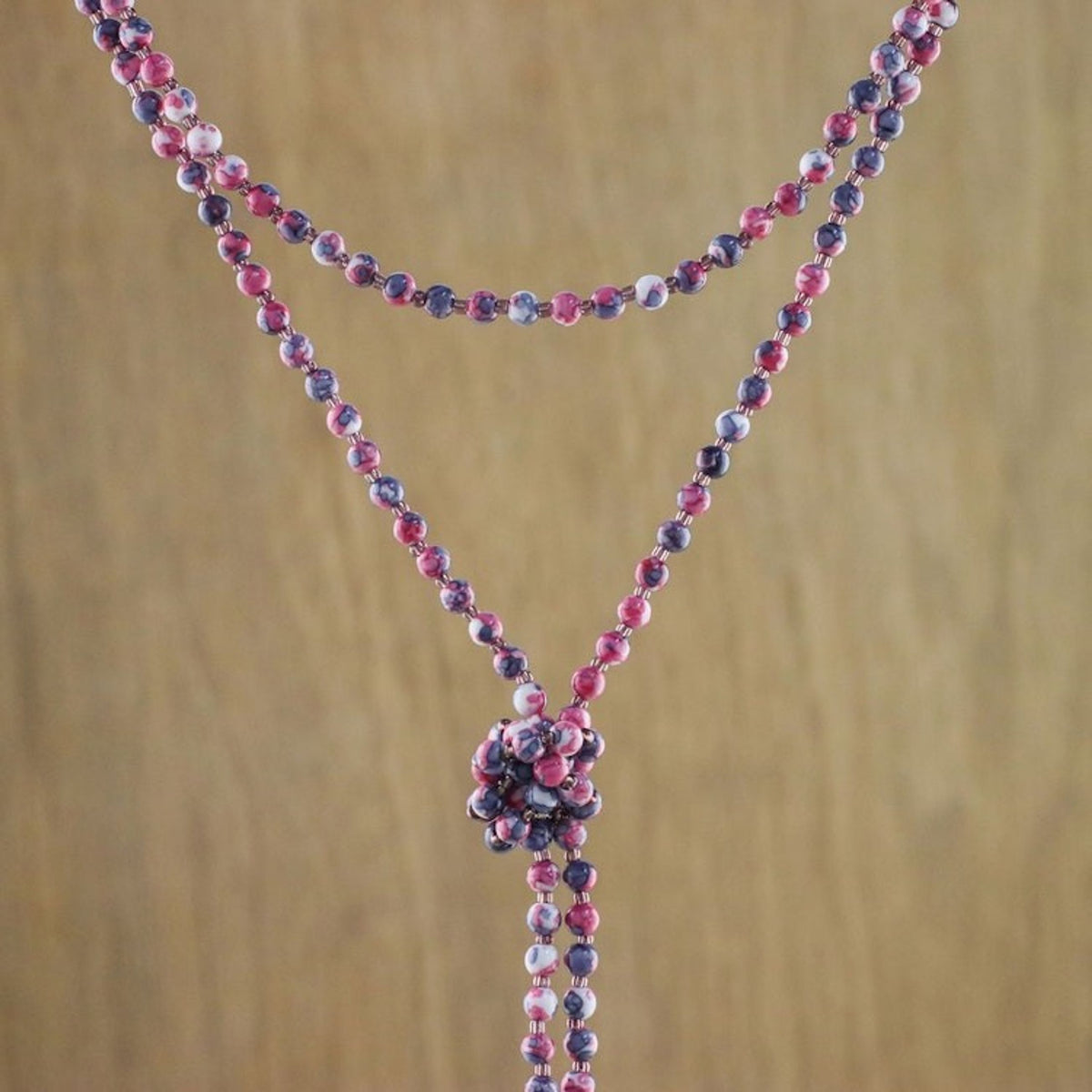 This Agate Beaded Lariat Necklace in Dark Red from Thailand 'Festive Holiday in Dark Red' is a vibrant accessory by Nareerat. The lariat necklace is beaded with agate beads in tones of pink and purple, alternating with petite clear glass beads. A knot pendant at the front culminates in dark red cotton tassels with brass beads, creating a festive look. This piece is a testament to her dedication to handcrafted jewelry that celebrates the beauty of color and nature.