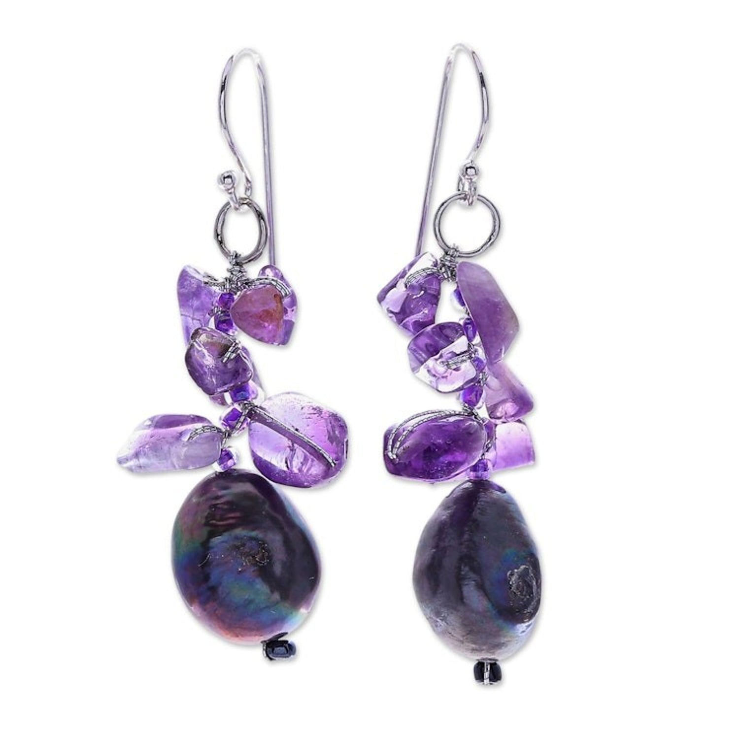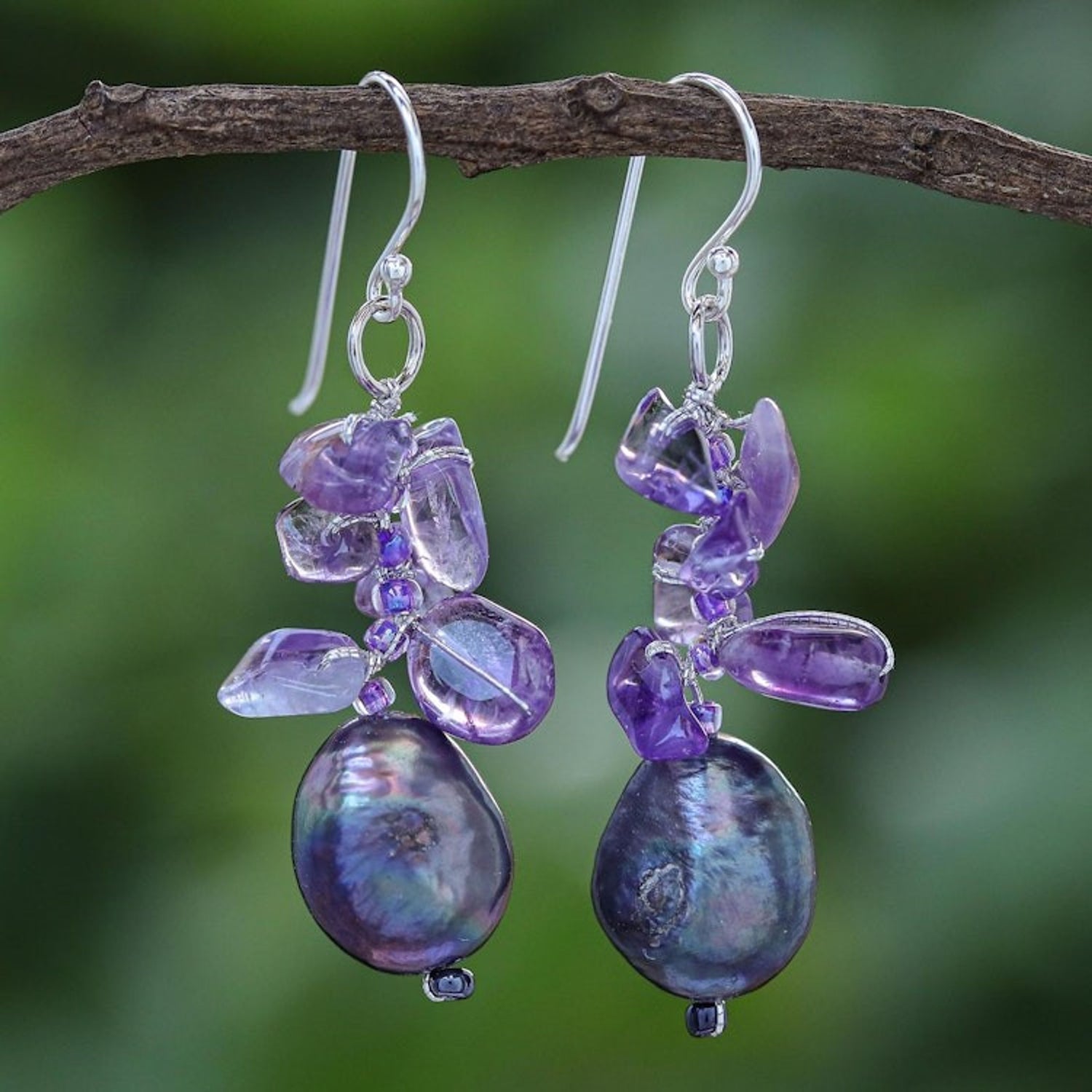 These Amethyst and Cultured Pearl Cluster Earrings 'Polar Sleep' are darkly beautiful and enchanting dangle earrings by Nareerat. The Thai artisan knots gemstone clusters by hand, accenting amethyst clusters with translucent glass beads. A dark grey cultured pearl suspended below adds a dash of mystery. The sterling silver hooks and high-polish finish complete the look. This piece is a beautiful example of her commitment to keeping the art of handmade jewelry alive for future generations.